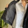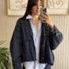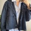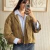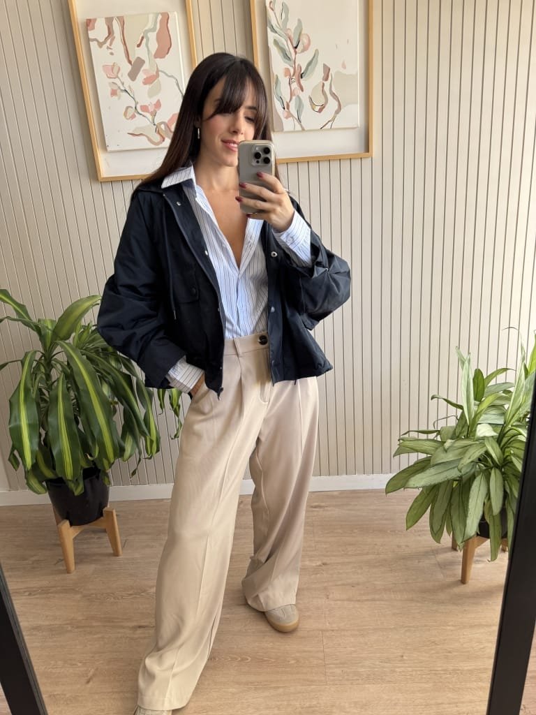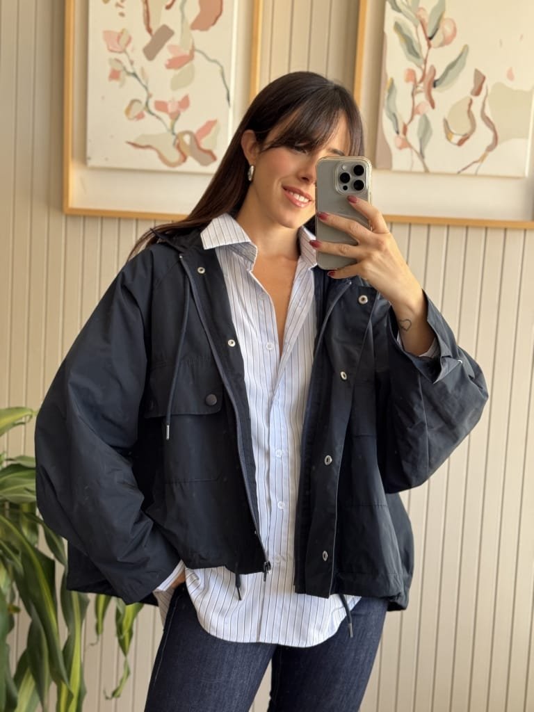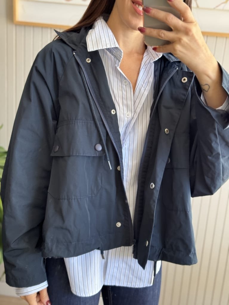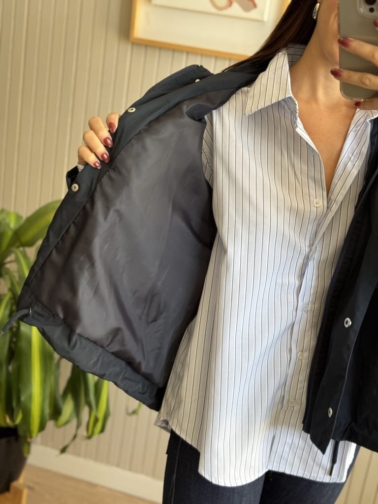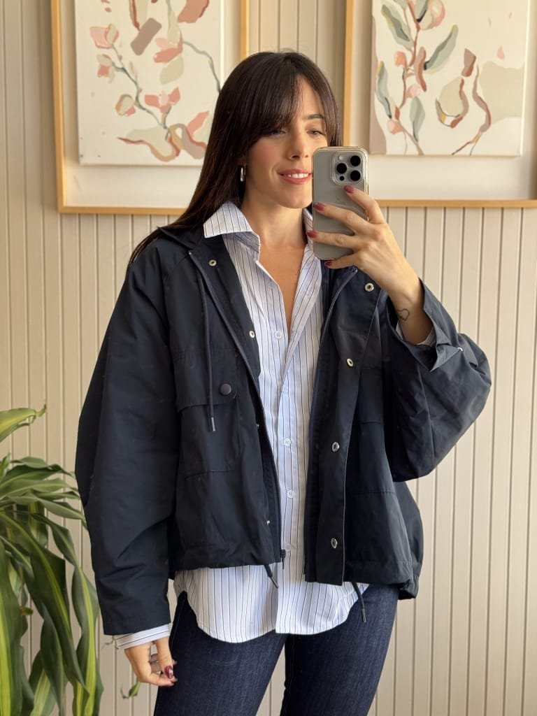 Campera tipo pilotin corto de sire. Tiene pinza centrel en espalda generando forma ebase.
