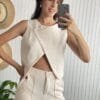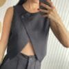 Chaleco cruzado de crepe sastrero, con 2 botones delanteros.
