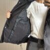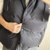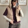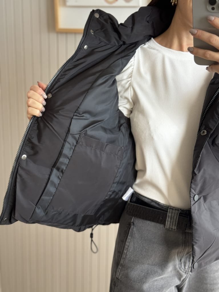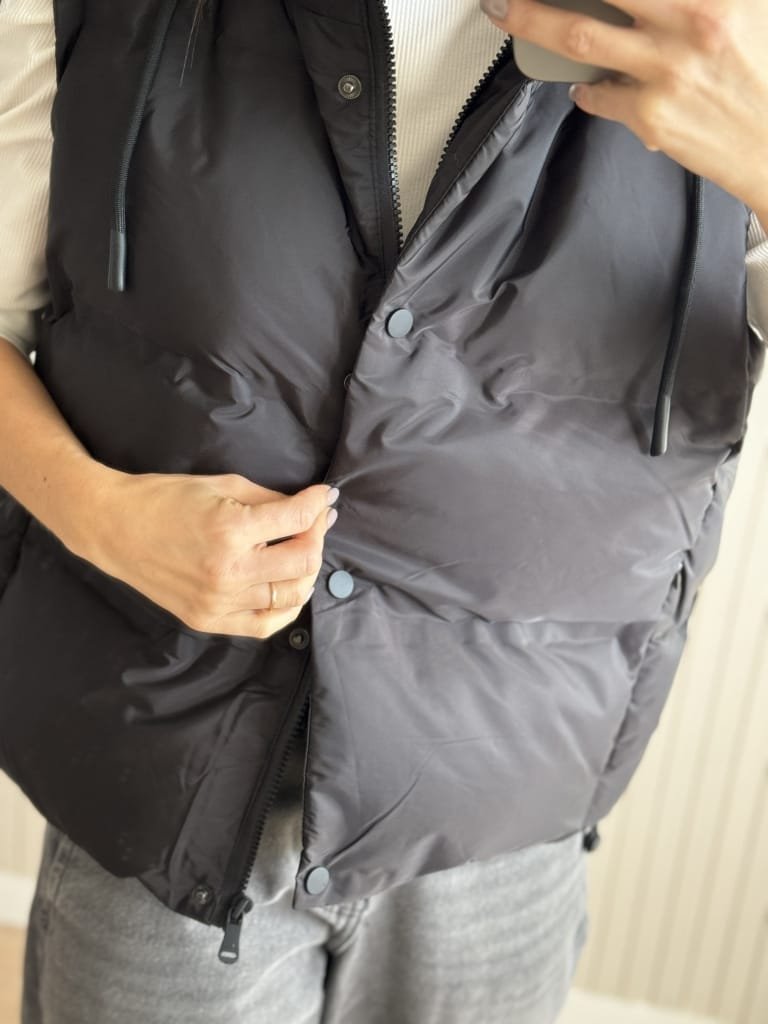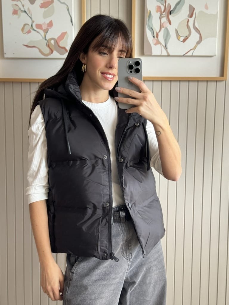 Chaleco corto de sire premium impermeable, con bolsillos laterales, cierre y botones al tono, capucha desmontable y cordones ajustables.