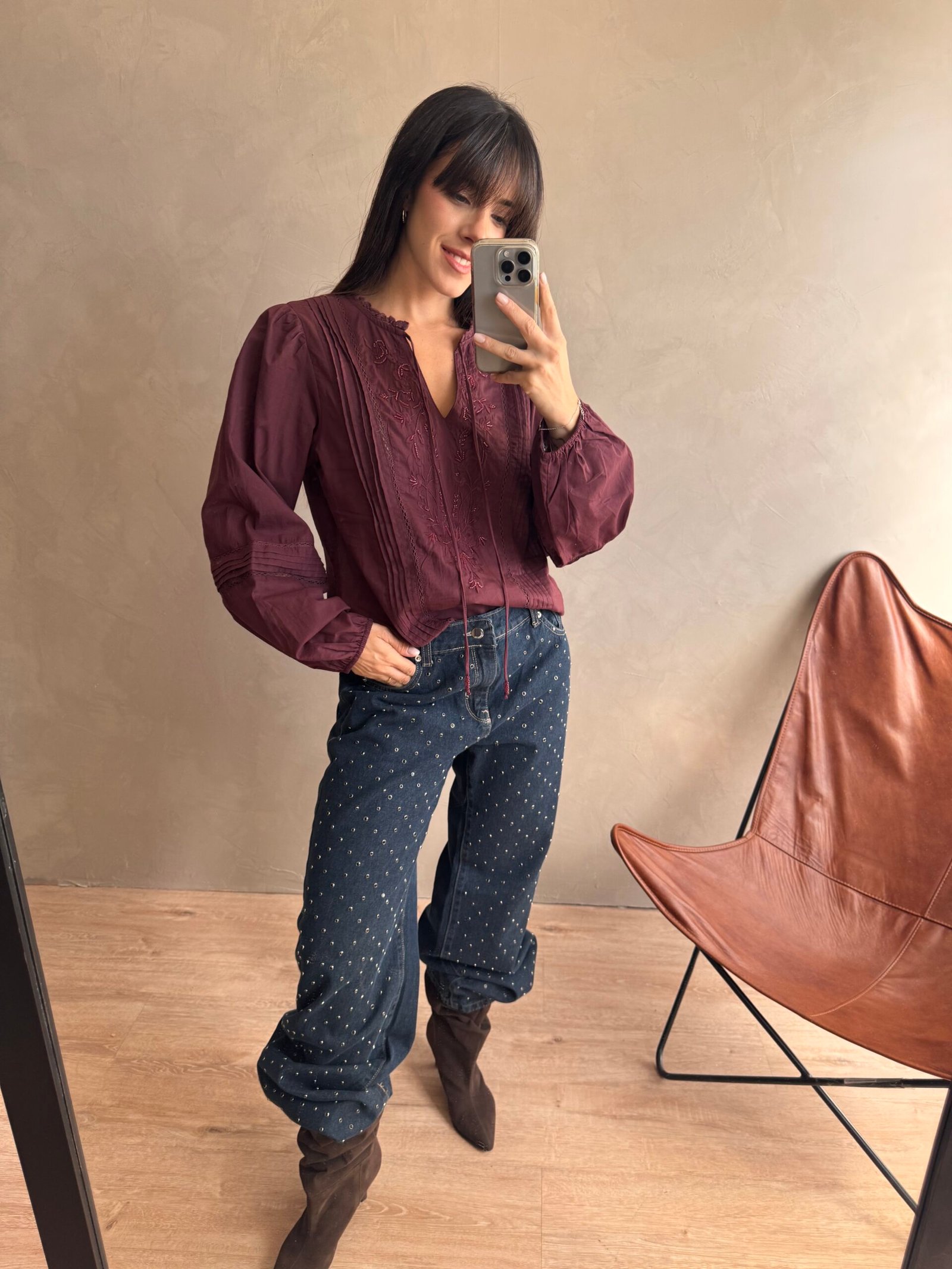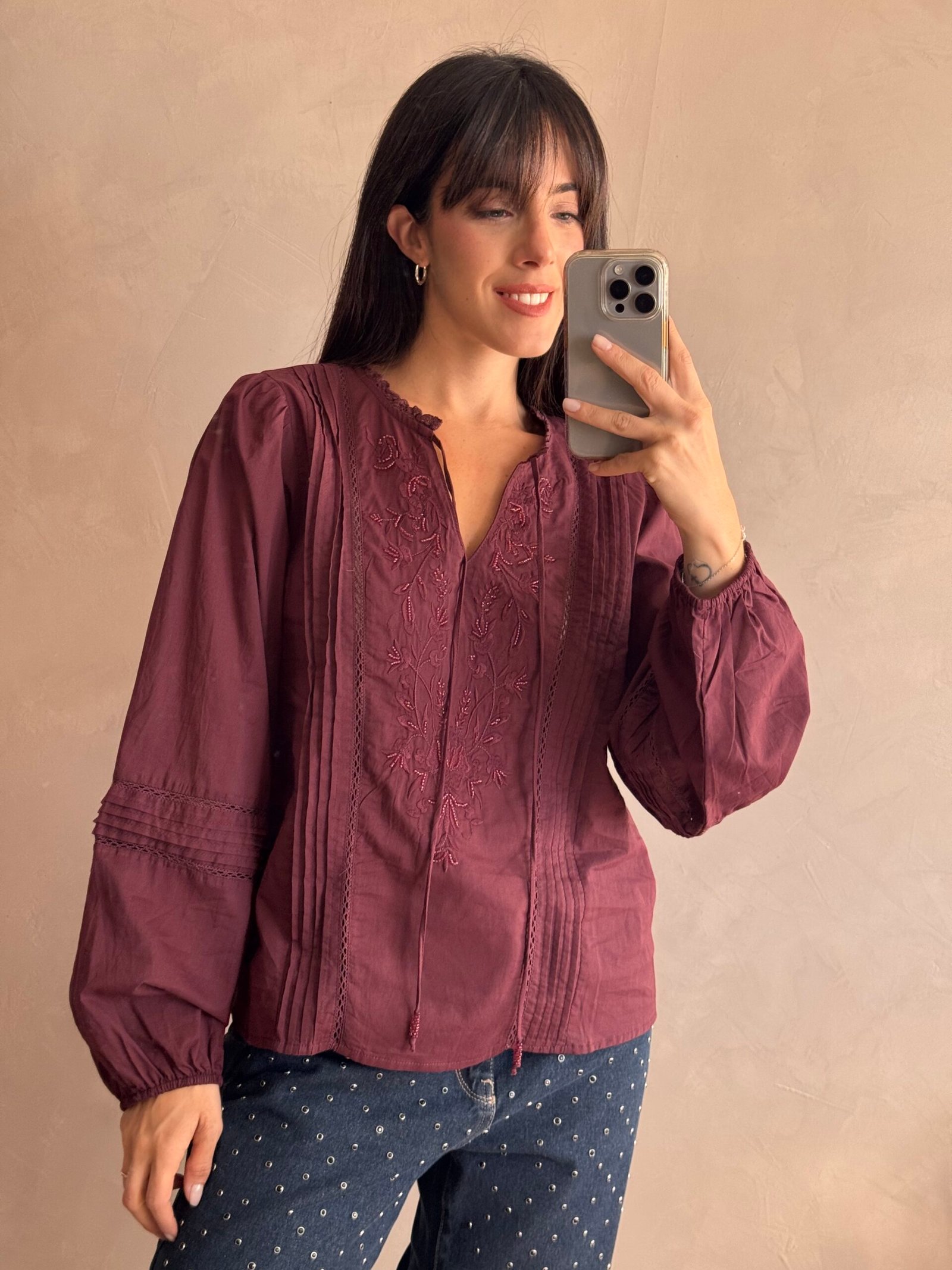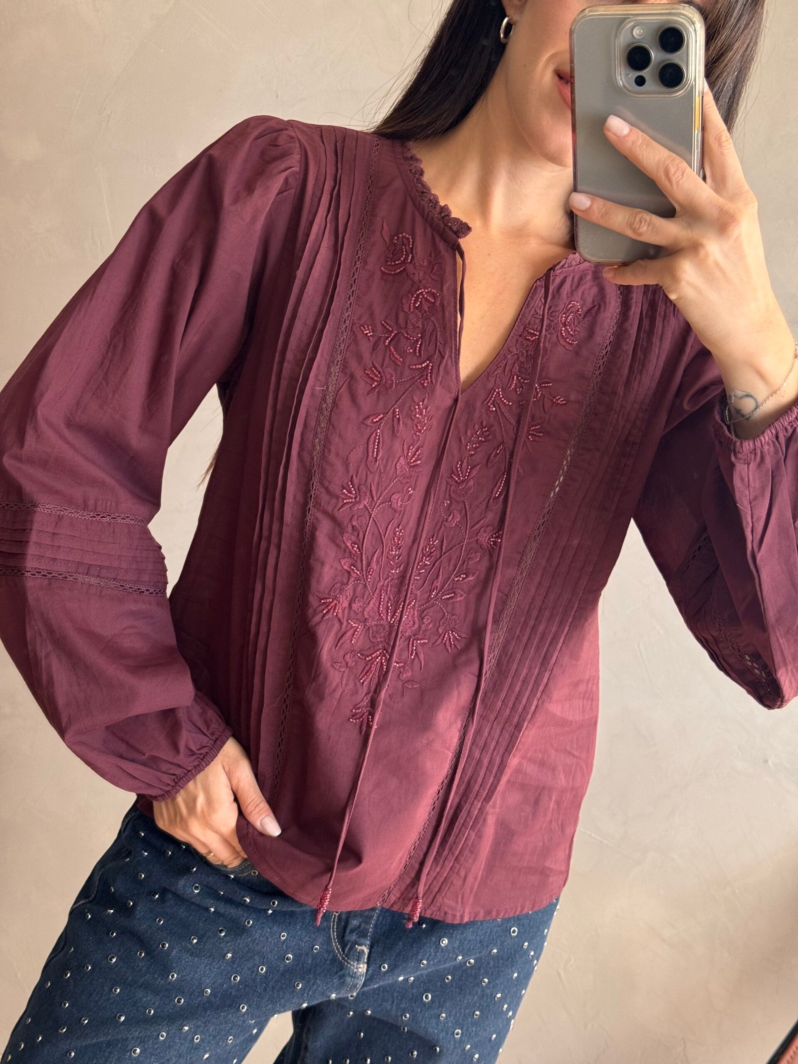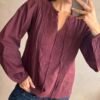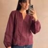Blusa de 100% algodón con cuello mao, bordado delantero y mangas trabajadas