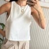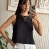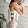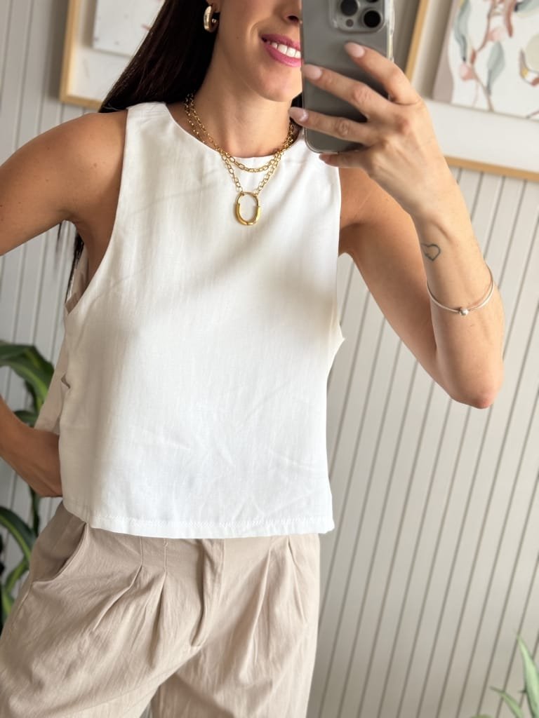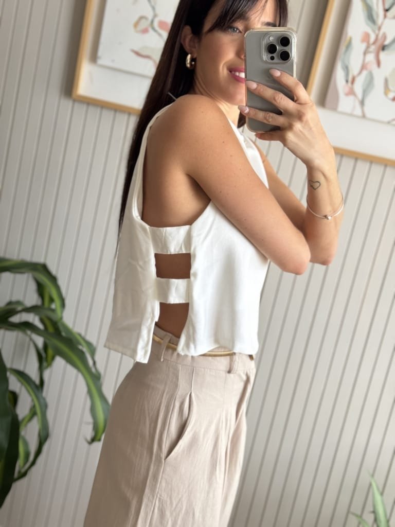 Top corto con vista interna en la delantera y en la espalda. No tiene costuras la vista. En el costado lleva dos tiras.