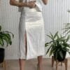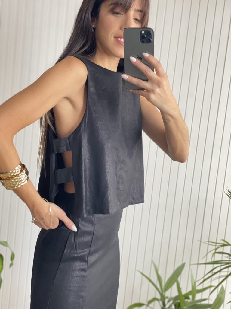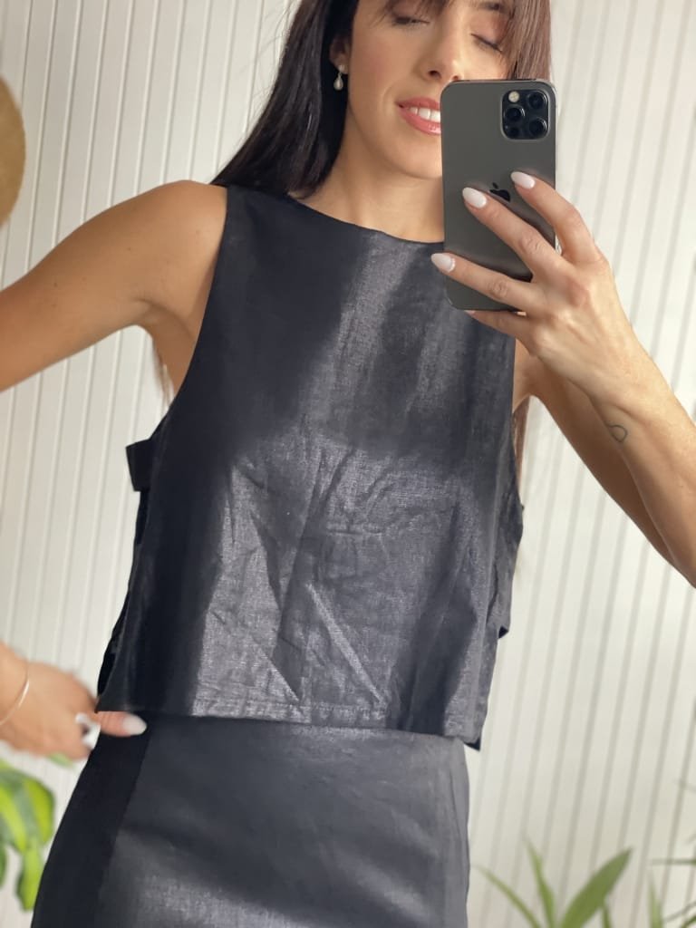 Confeccionada en lino con foil (que es lo que le da brillo)