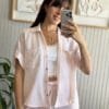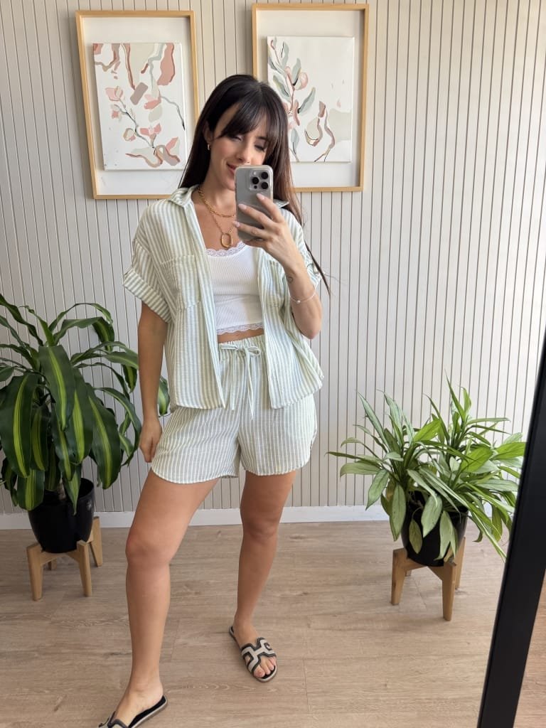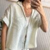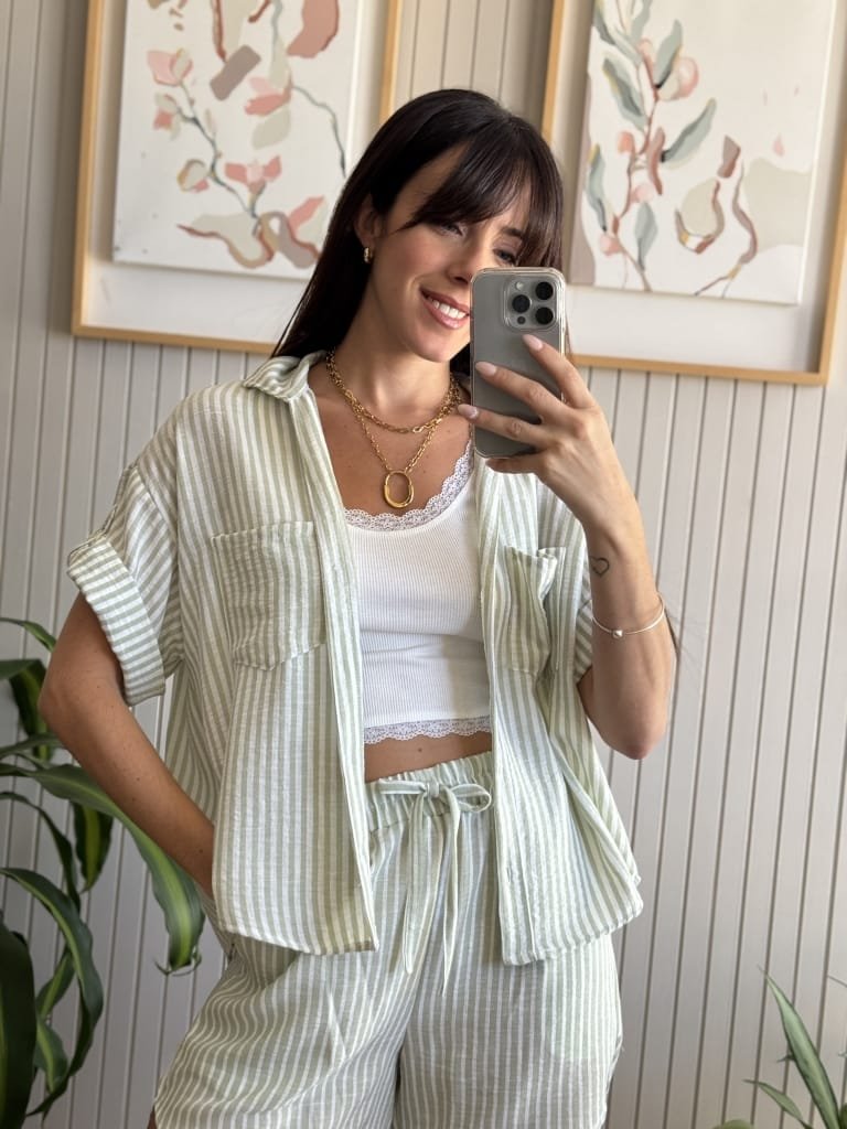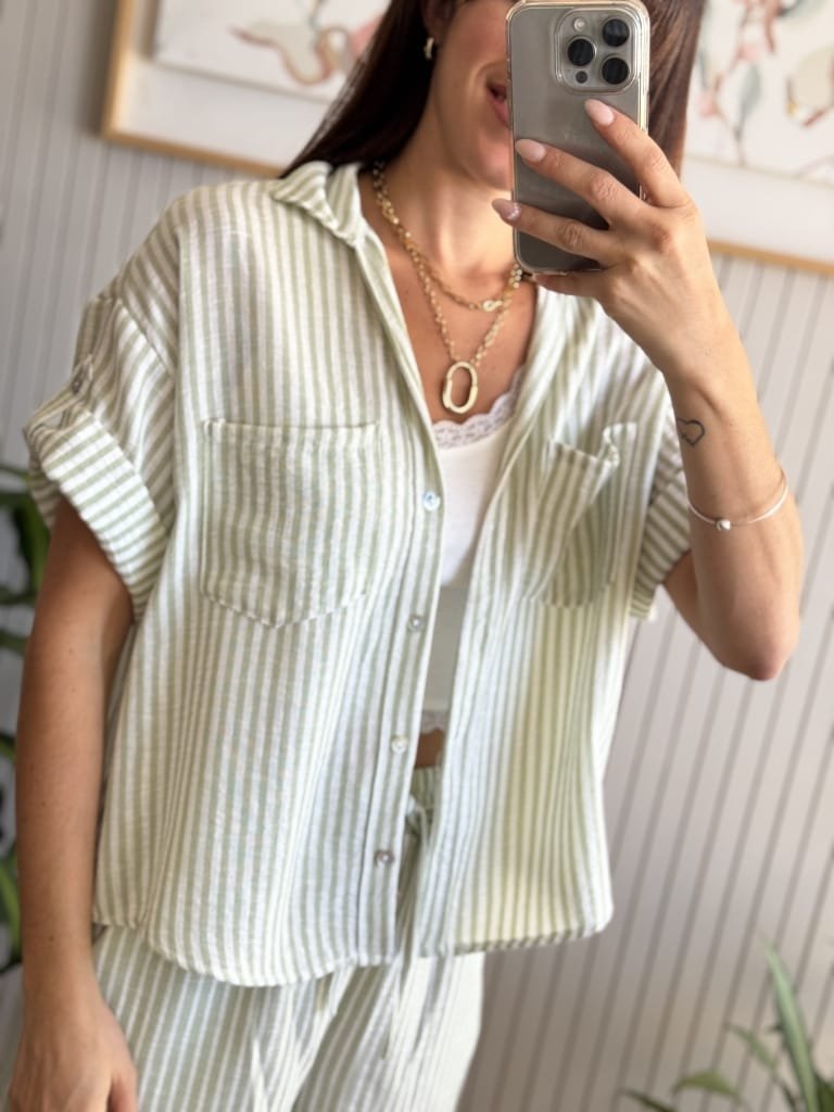 Camisa rayada de hilo de algodón con agarraderas en las mangas y botones de nacar