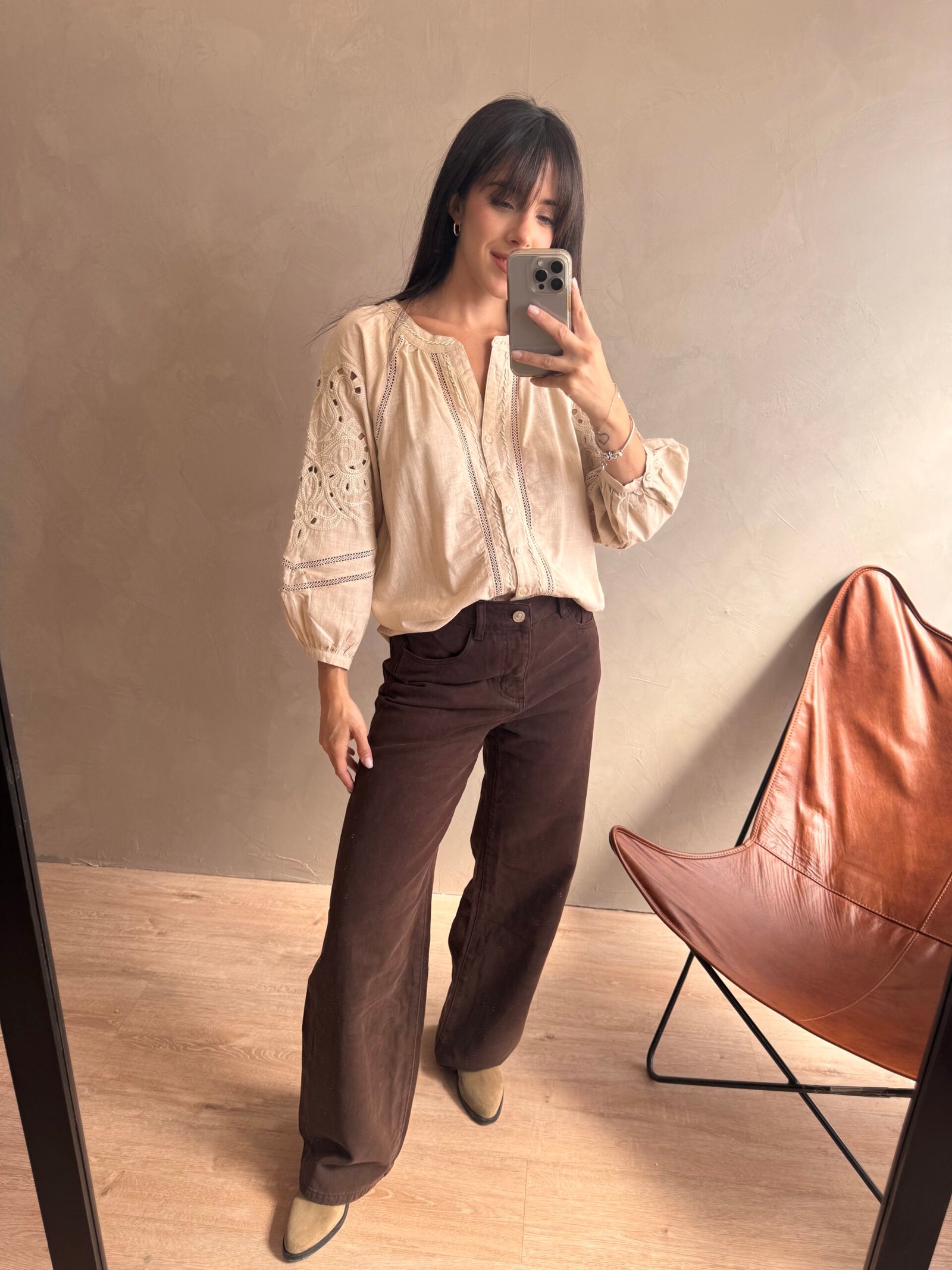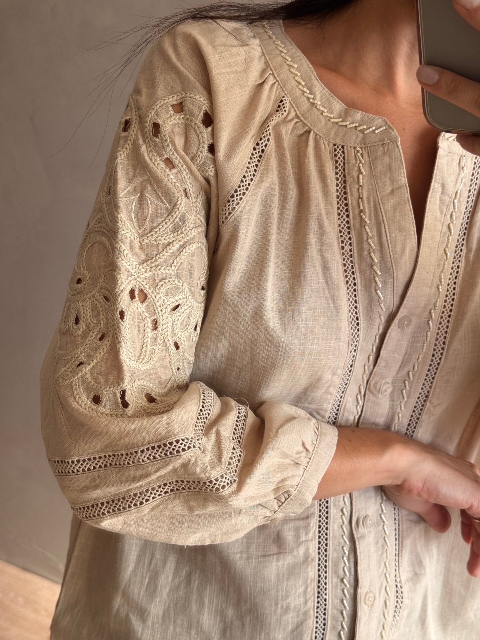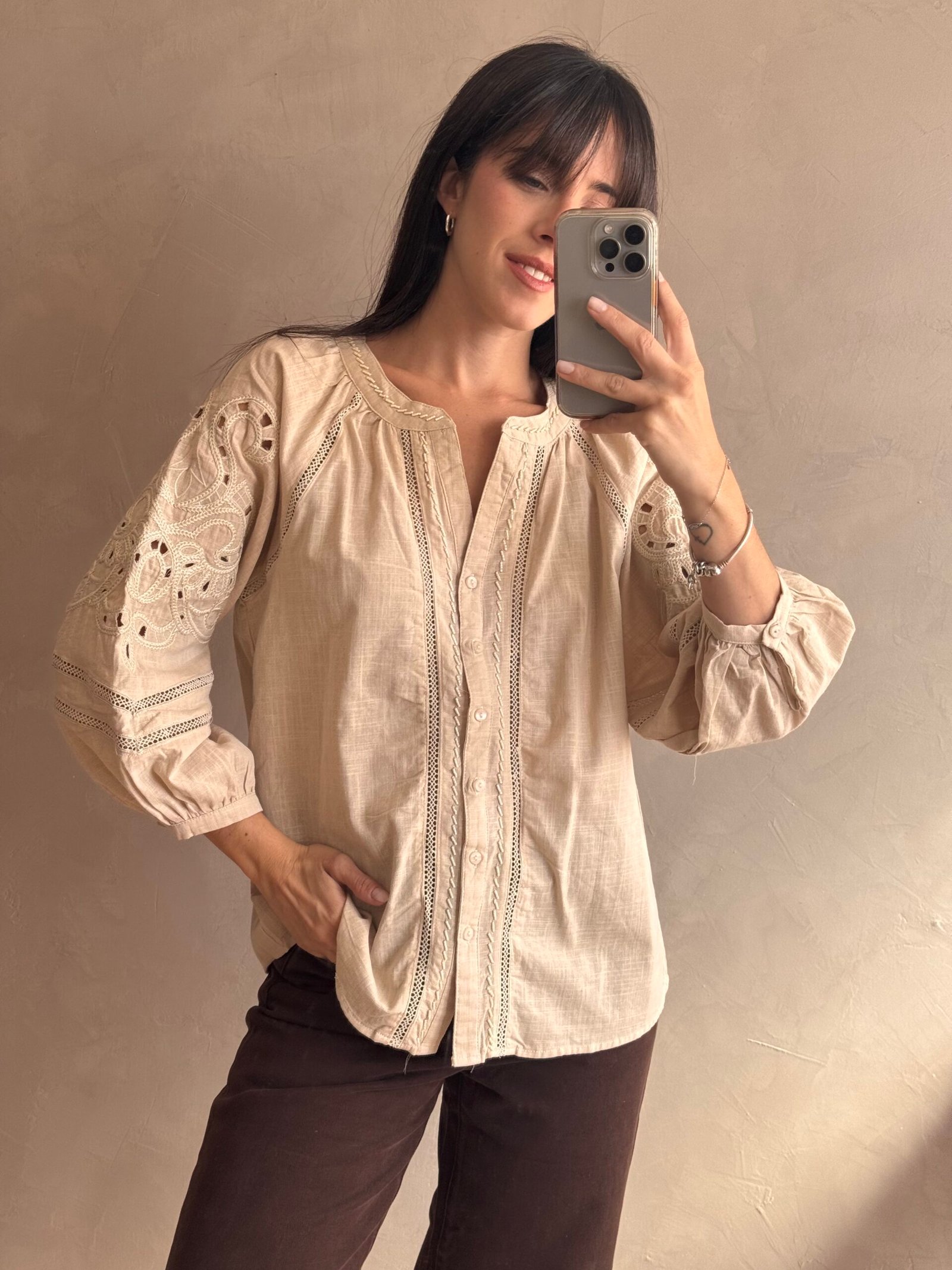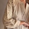 Camisa 100% de algodón con cuello mao, mangas caladas y bordado al tono