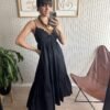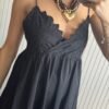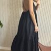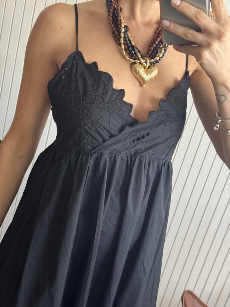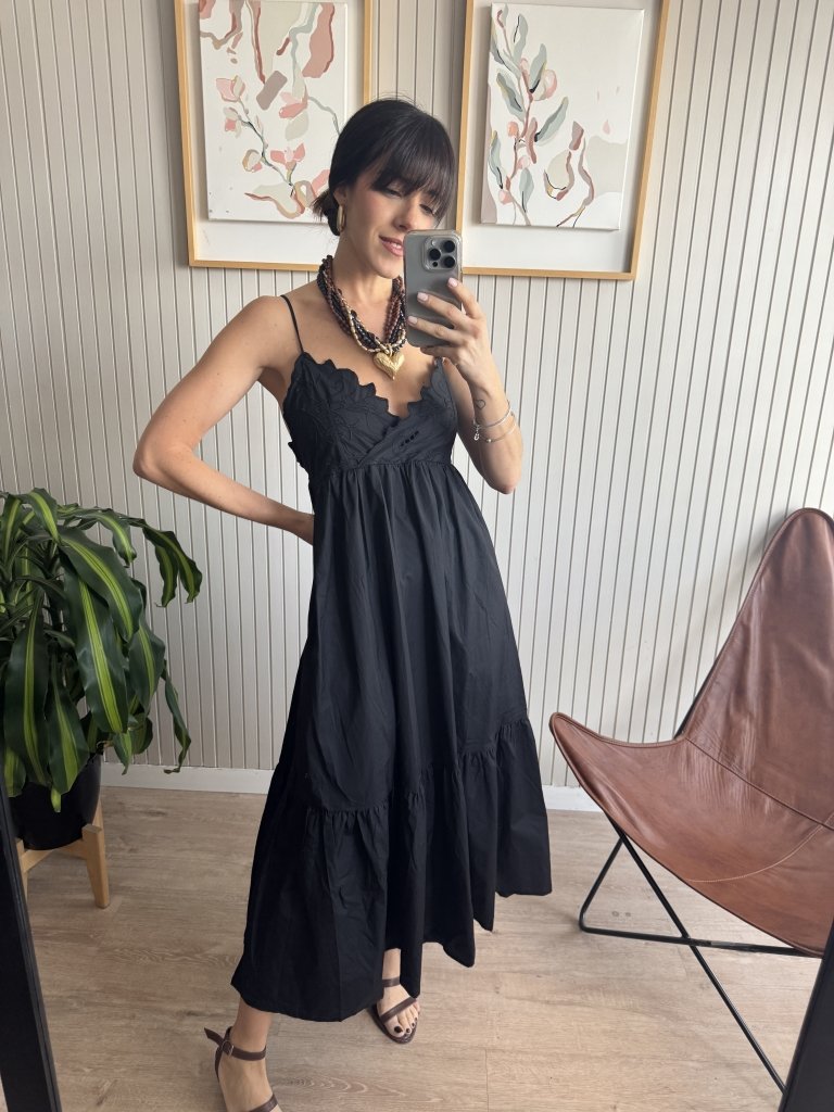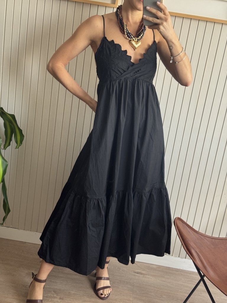 Vestido largo de bretel fino. Detalle de bordado calado en copa de busto. Elástico en la espalda para entalle. Vuelo amplio de falda con recorte con frunces.