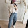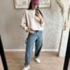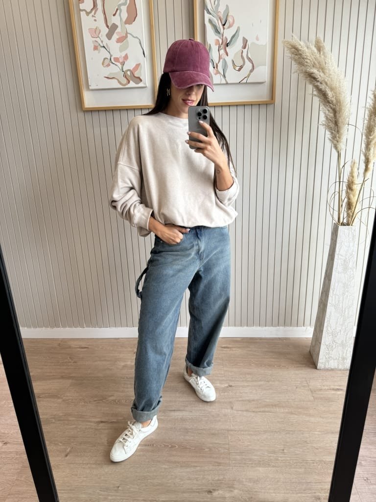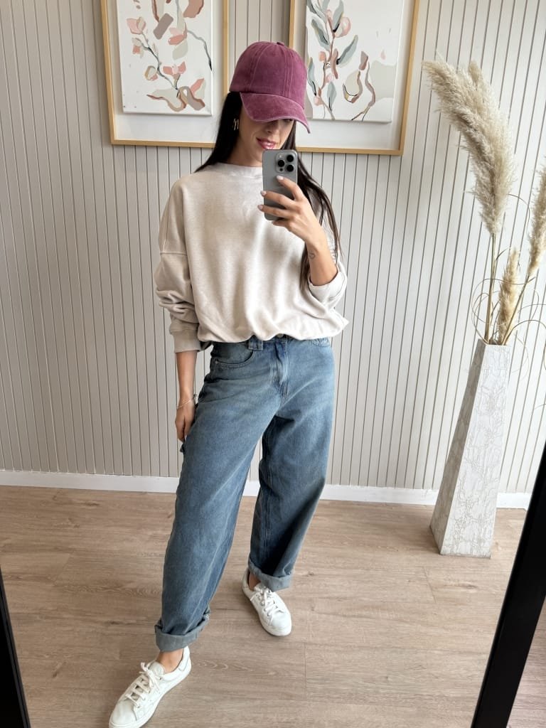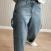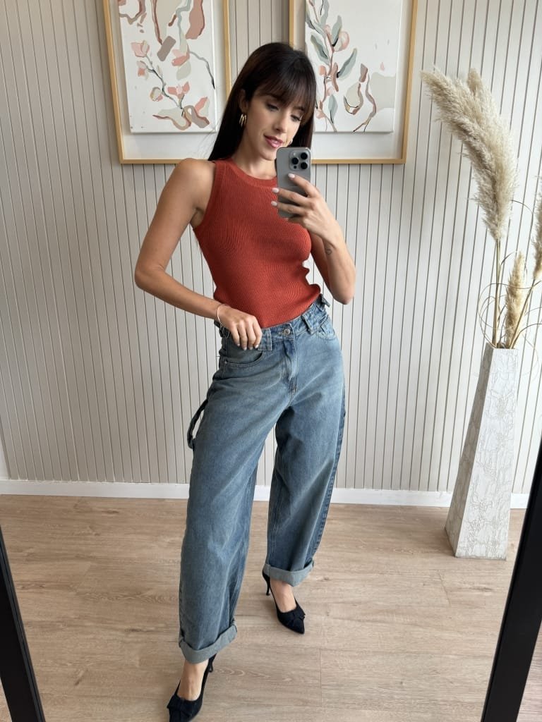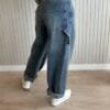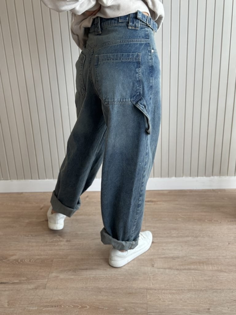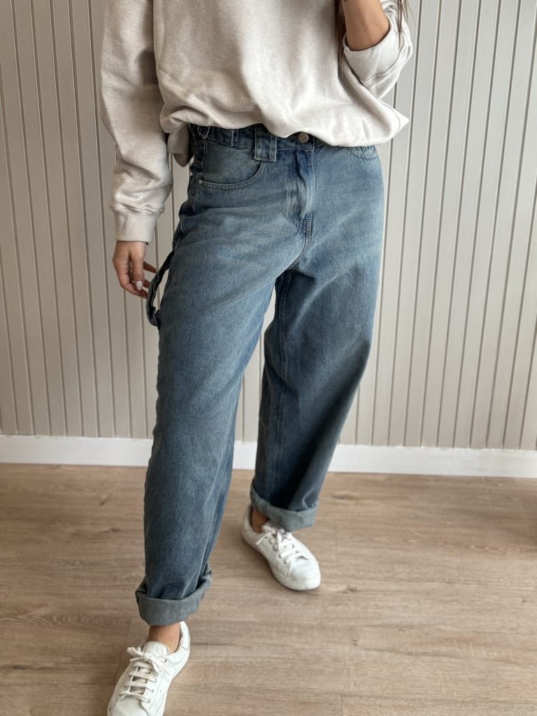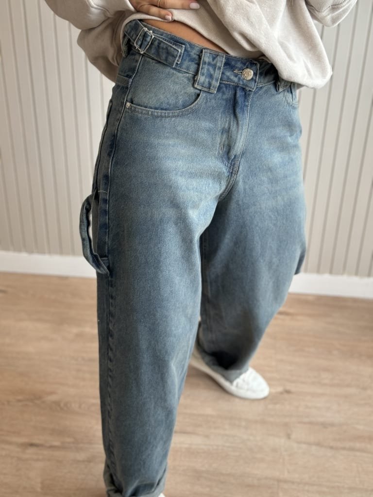 Jean baggy corte globo. Tiro alto. Detalle de tiras ajustables con reguladores en la cintura