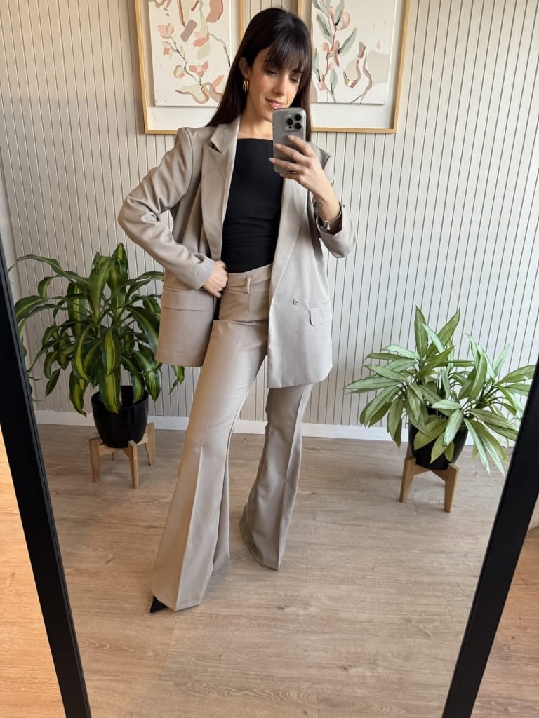 Pantalón sastrero oxford. Queda al cuerpo y se ensancha en la botamanga. Tiene el detalle de la doble cintura. Cierre invisible al costado y bolsillo falso en la trasera con un botón.