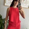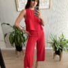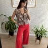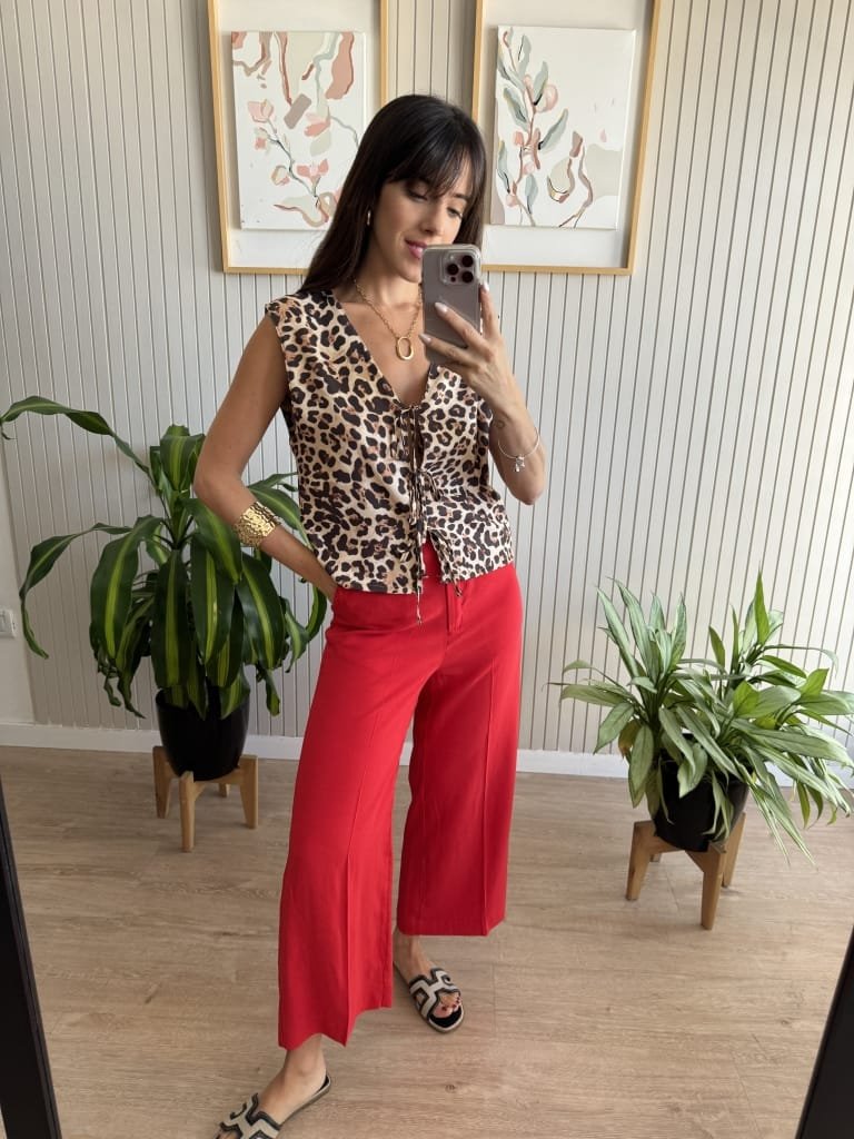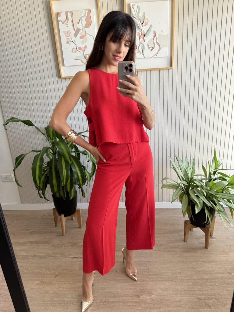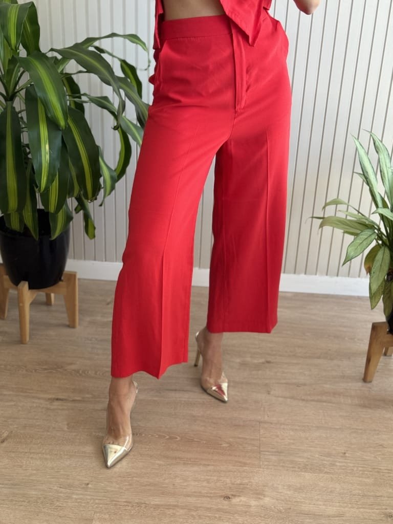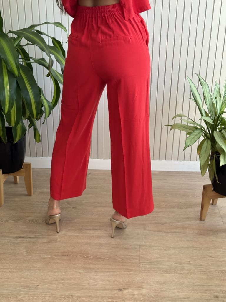 Pantalón corte sastrero con cierre y botones escondidos. Lleva bolsillos a los costados. Bolsillos falsos en la trasera y elástico en la cintura. Plancha al medio en la pierna