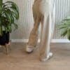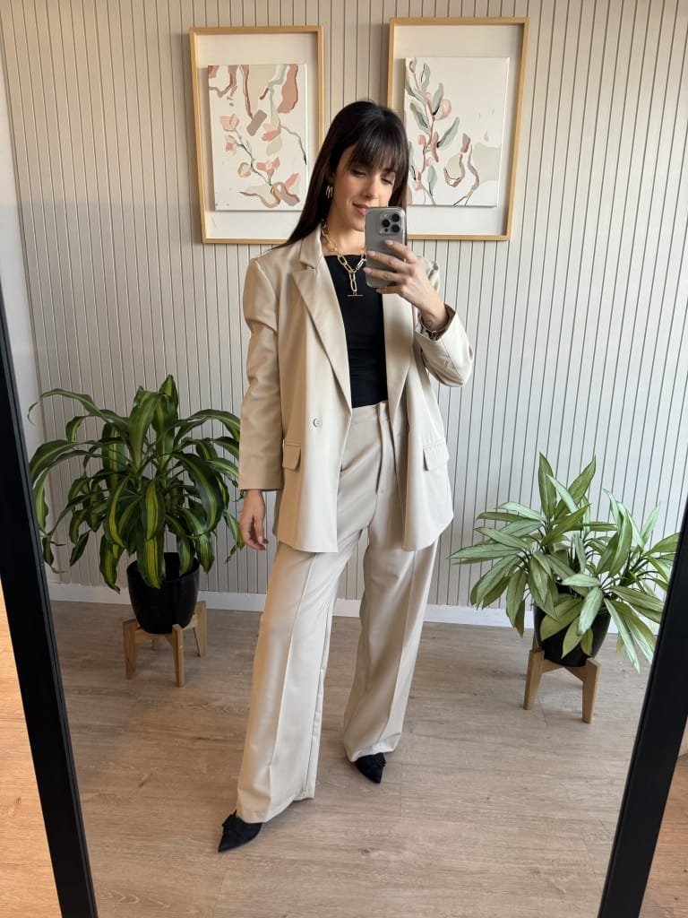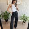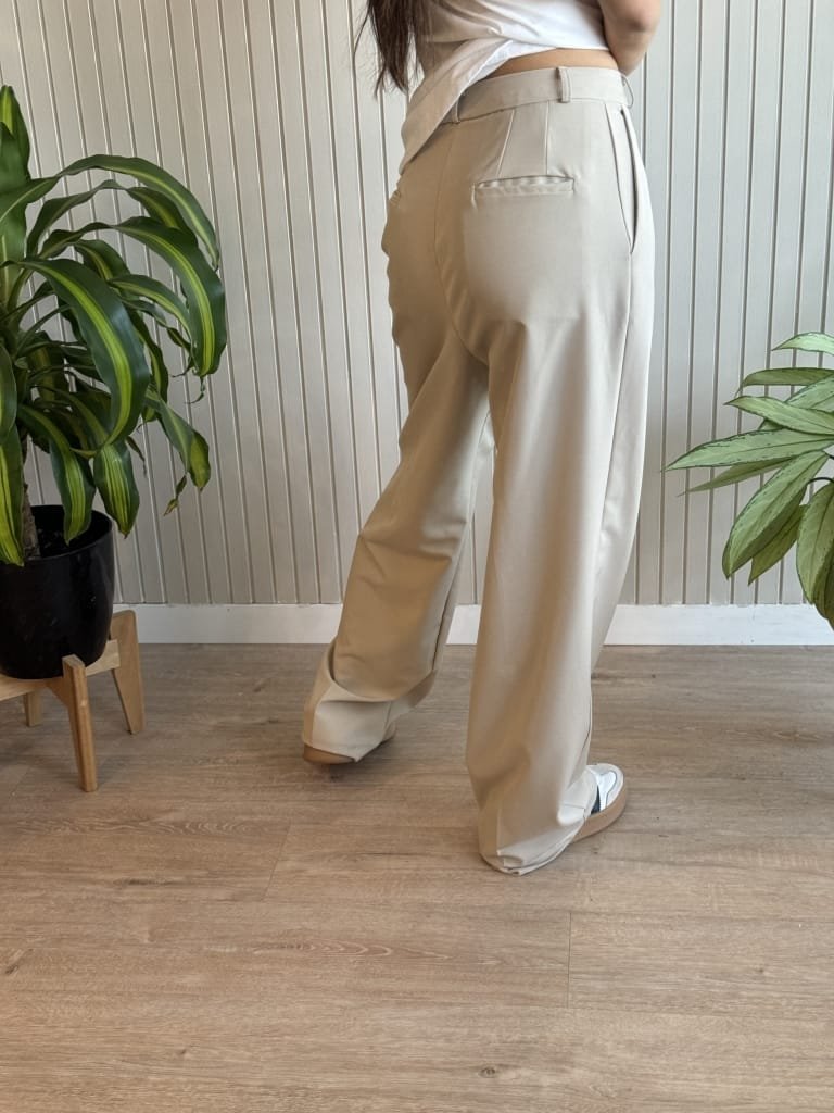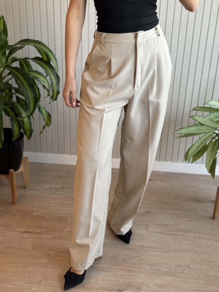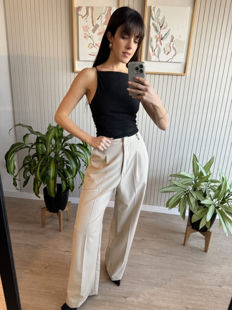 Pantalón sastrero wide leg tiro alto. Lleva cintura con gancho pantalonero por dentro y cierre. Plancha al medio en las piernas. Bolsillos al costado y bolsillos falsos con recortes en la trasera.