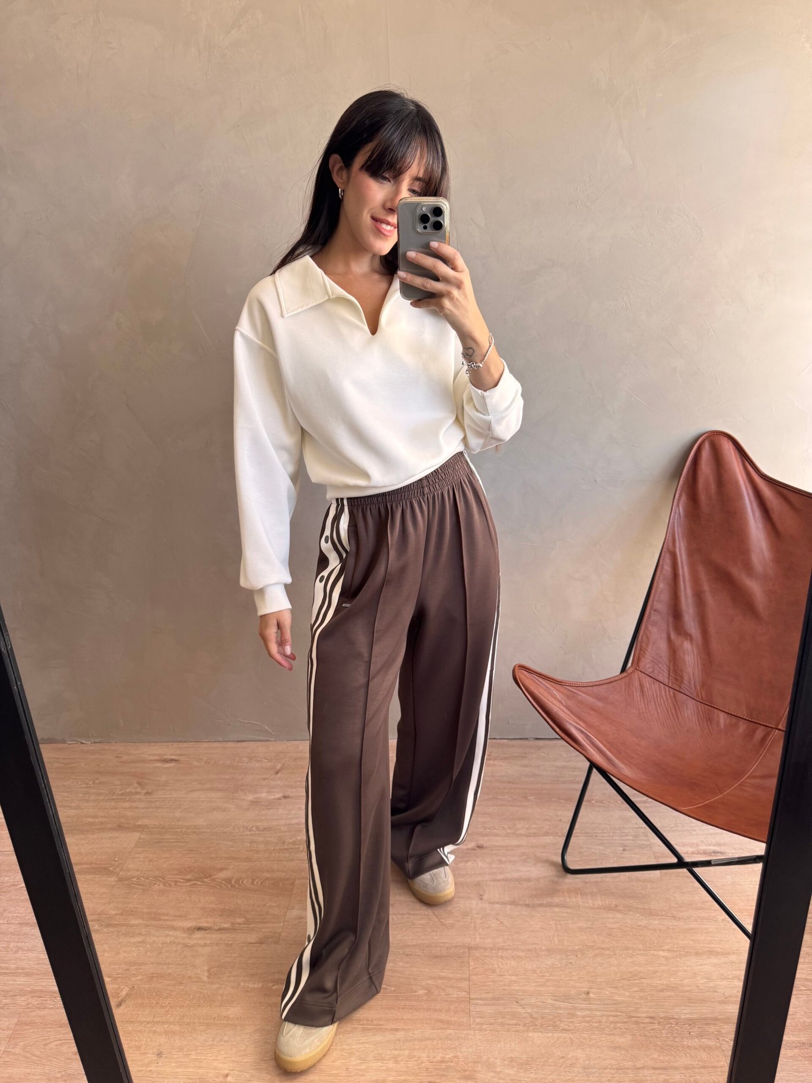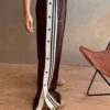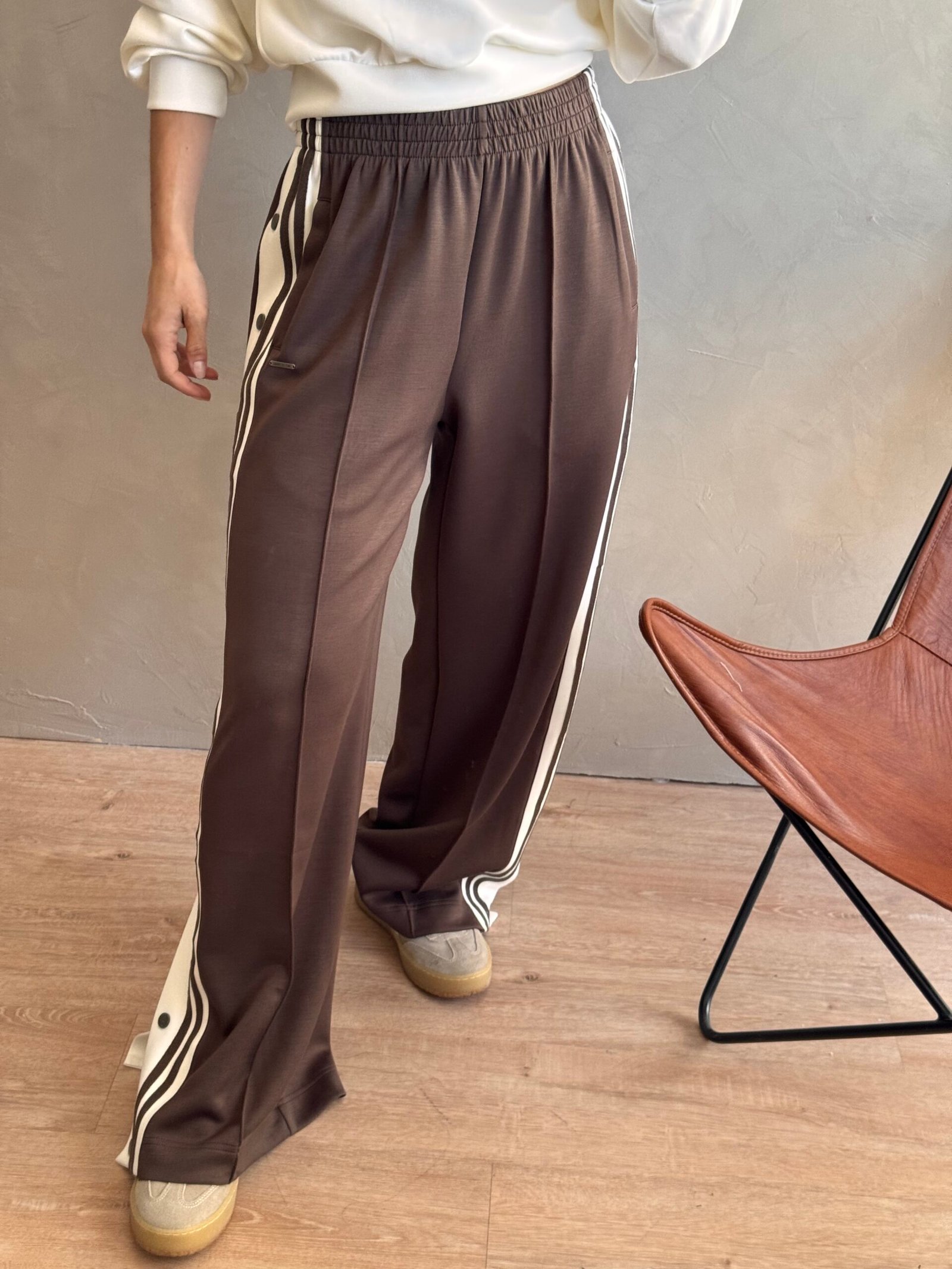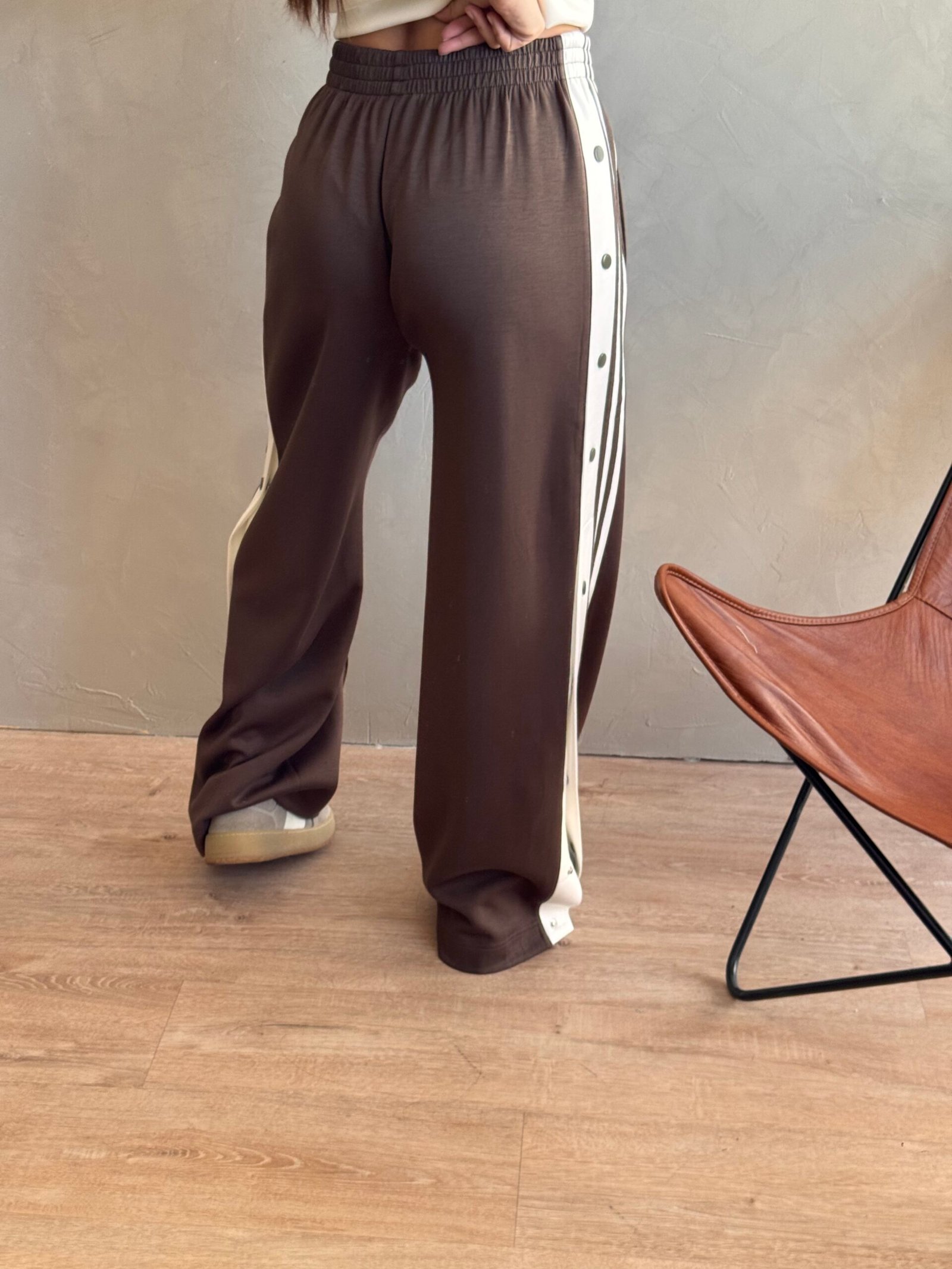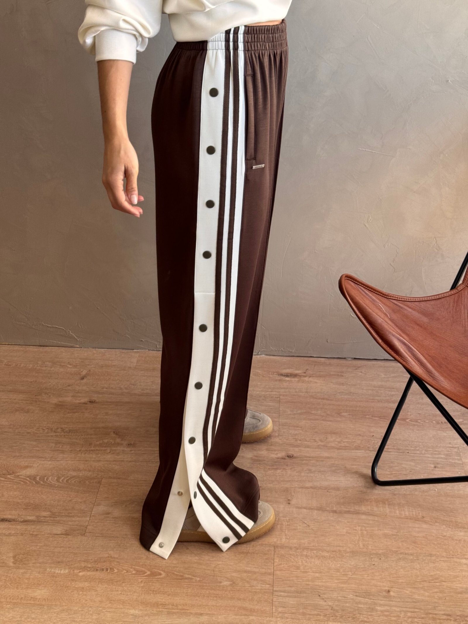 Pantalón con cintura elastizada , doble línea lateral blanca y broches al tono que se abren hasta media pierna. Bolsillos funcionales laterales.