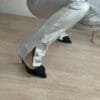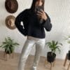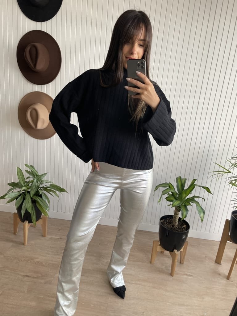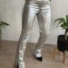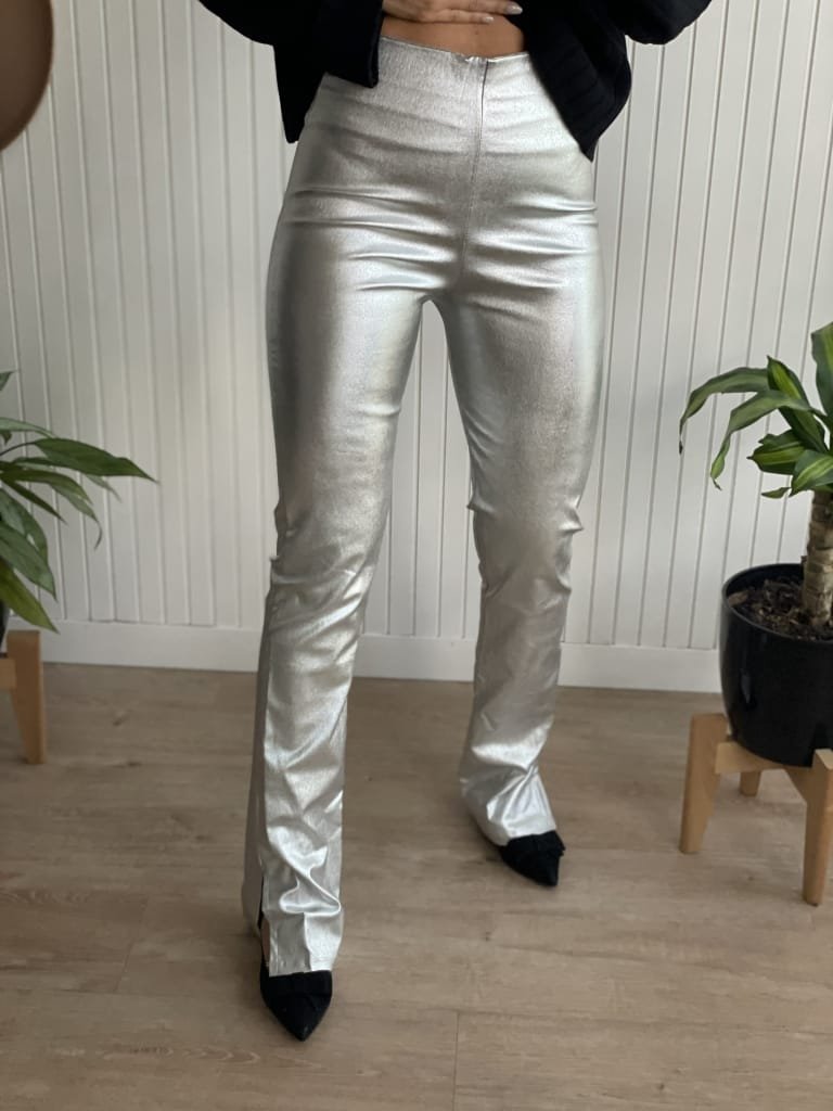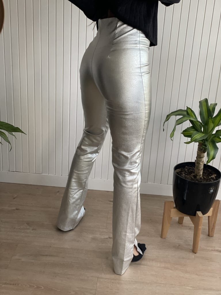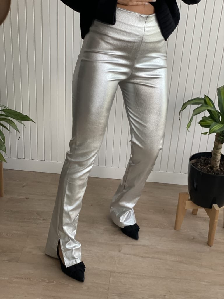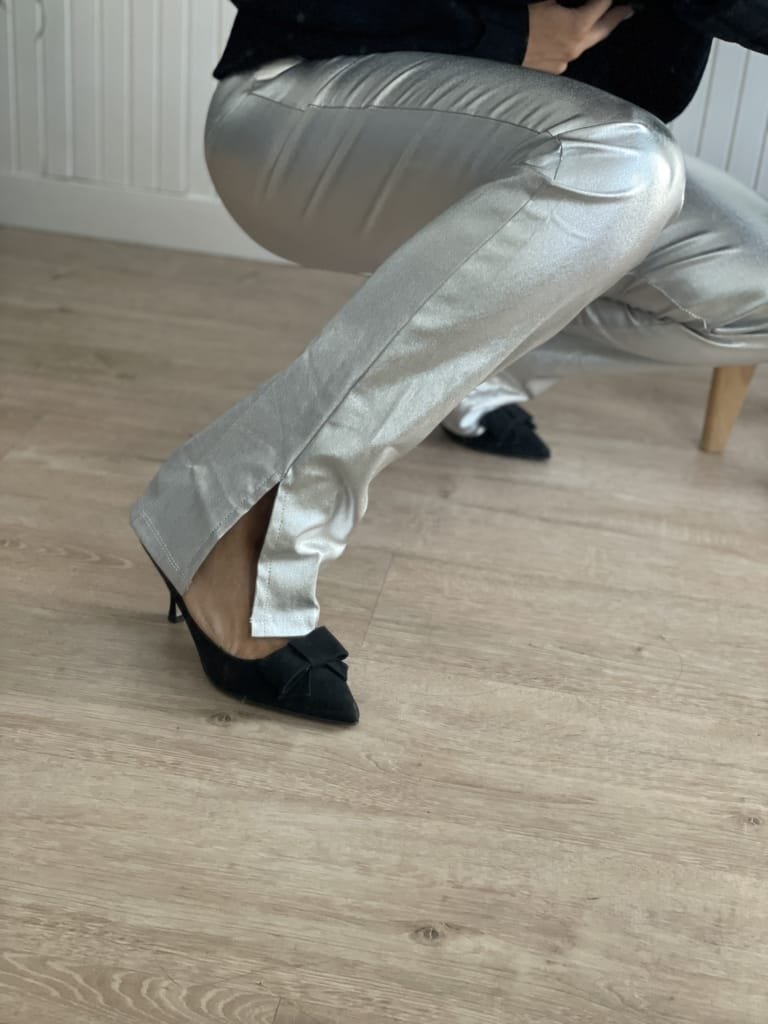 Calza de bengalina elastizada metalizada. Detalle de tajo en la parte externa de la pierna