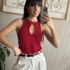 Top De Microfibra Doble Torsión Sin Mnagas. De Estilo Musculosa Con Terminacion De Vivos A Tono En Cuello Y Sisas. Calce Fit Al Cuerpo Y Largo Hasta La Cadera. Detalle En Escote Delantero De Accesorio Metálico Con Sustracción