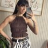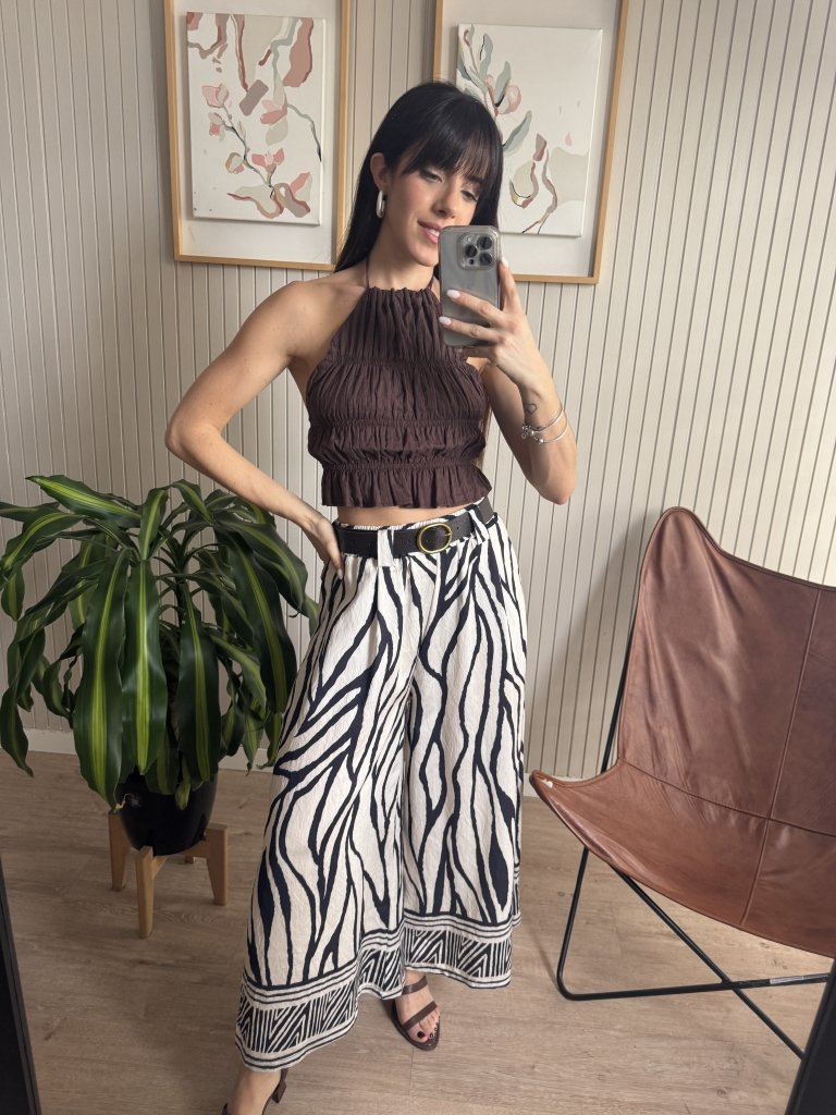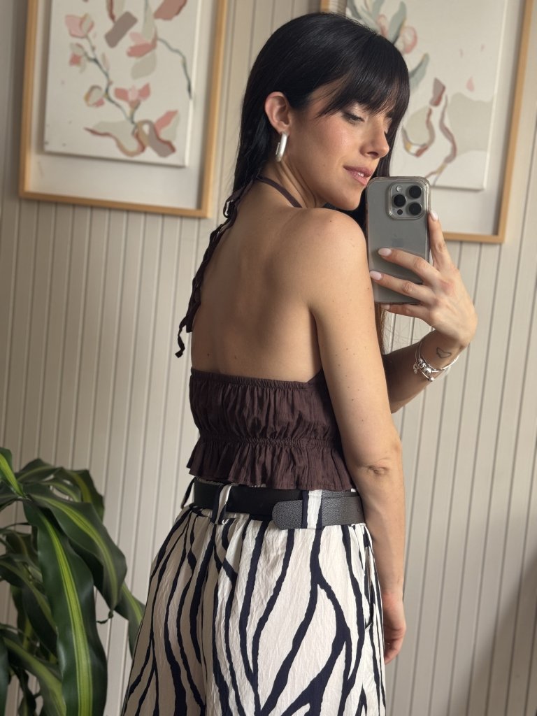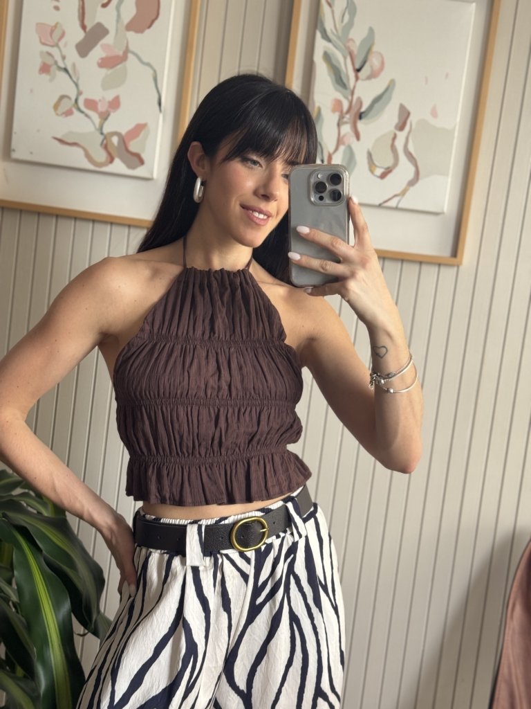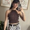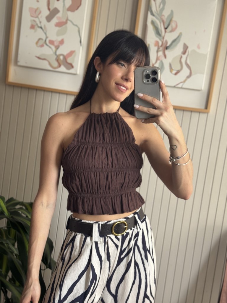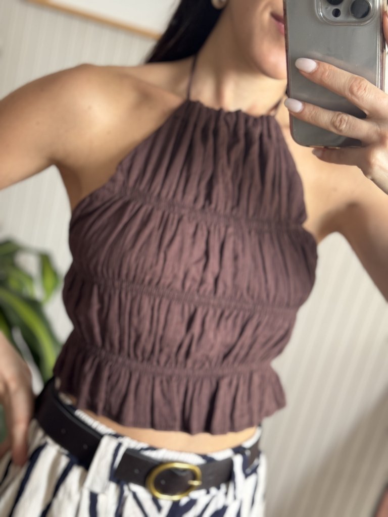 Top de cuello holter fruncido confeccionado en algodón tramado