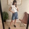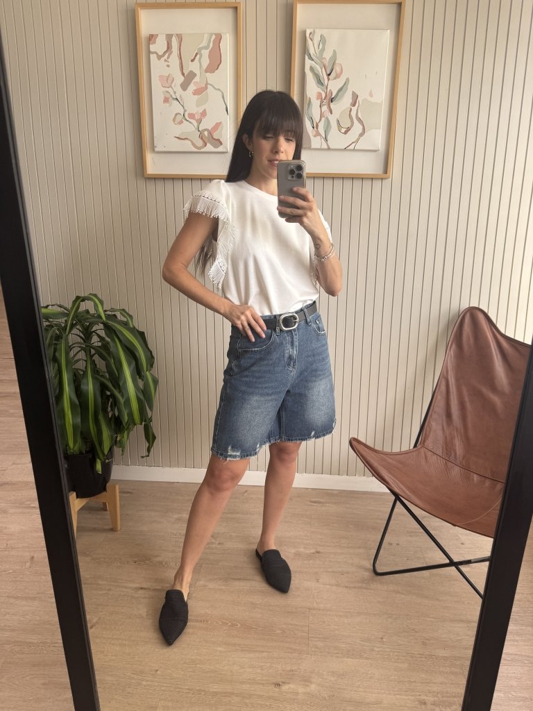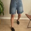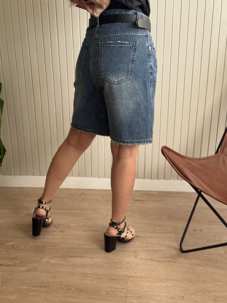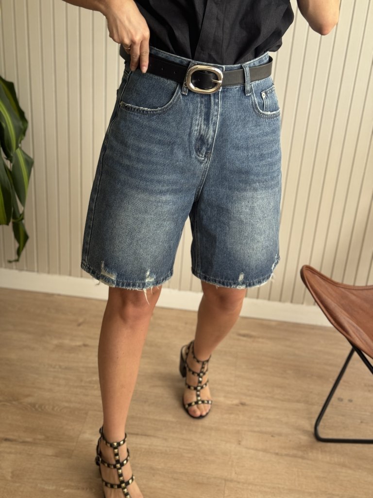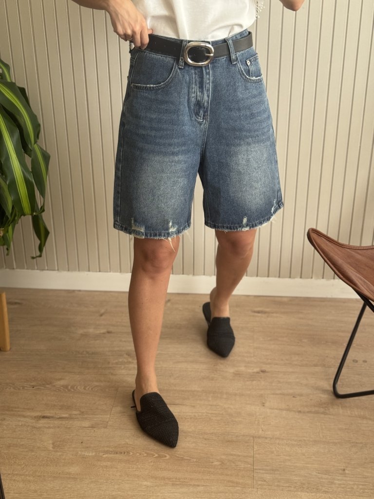 Bermuda de jean clásica confeccionada en jean rígido con un pequeño lavado y roturas en el dobladillo