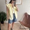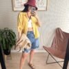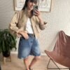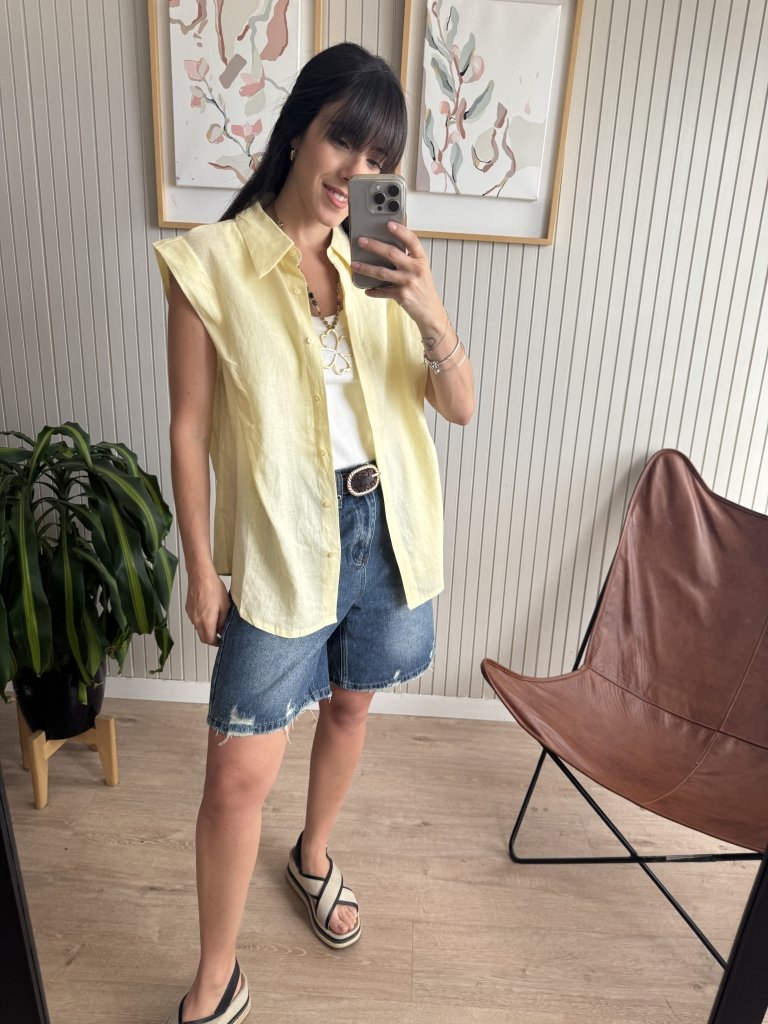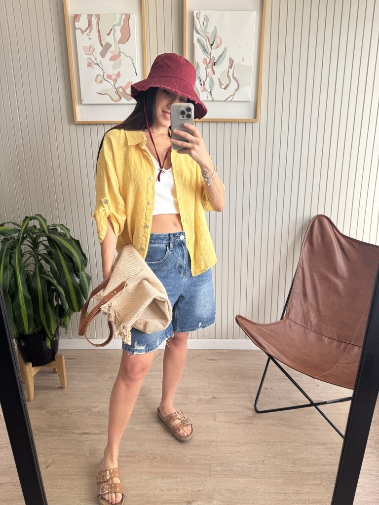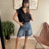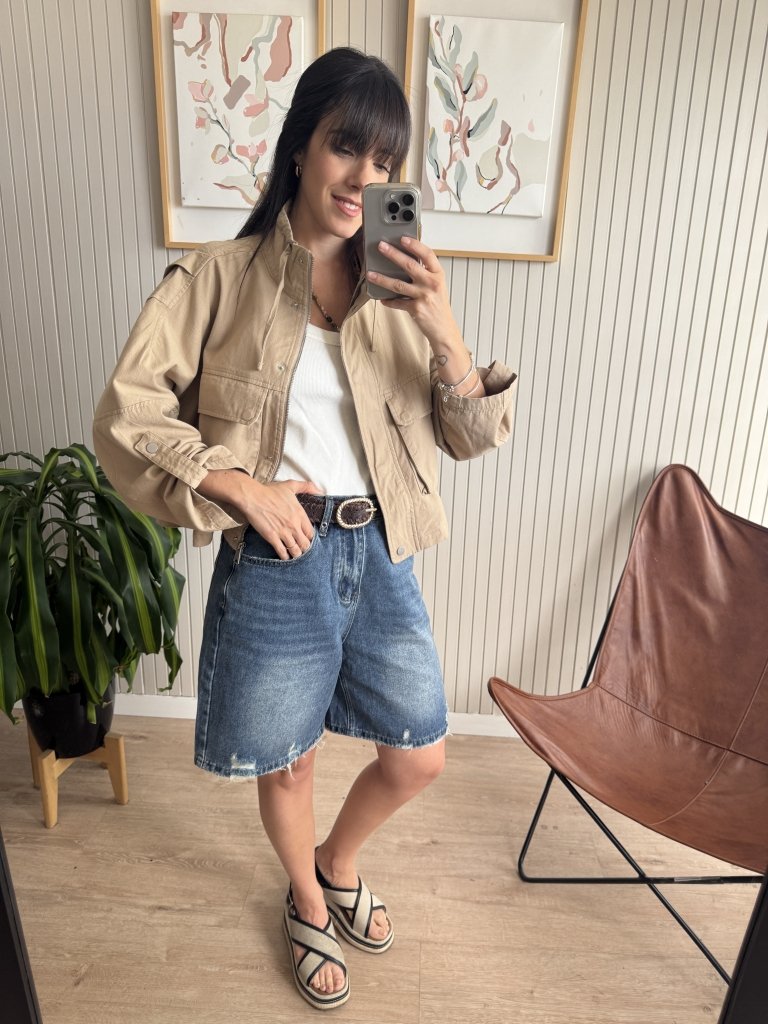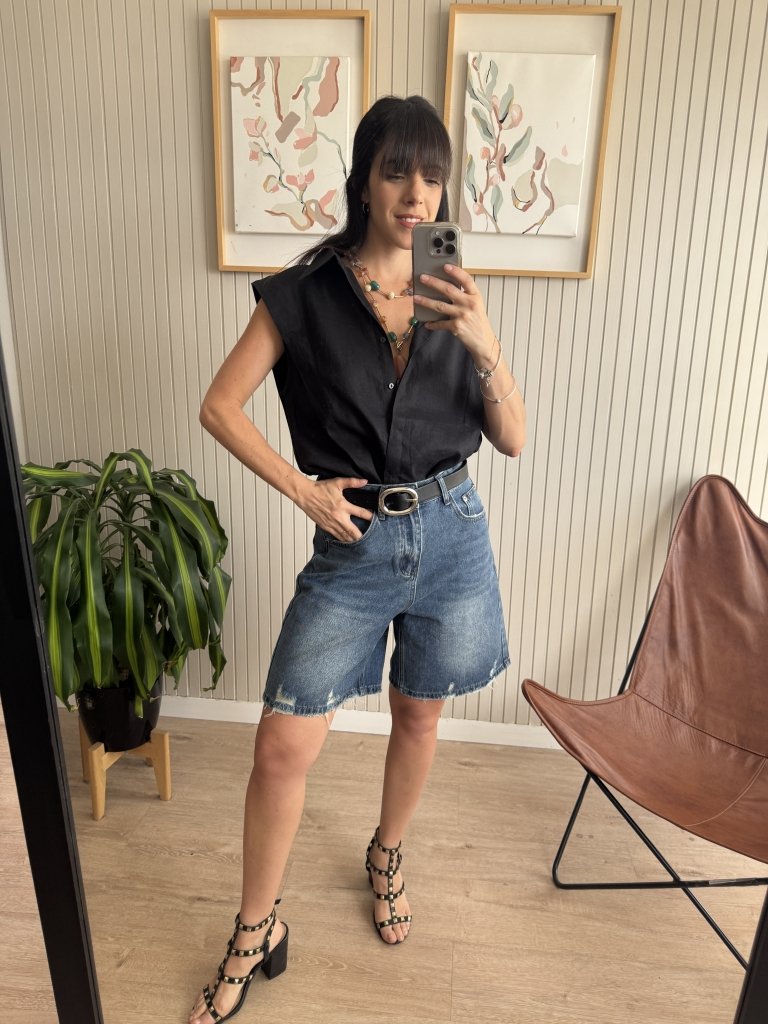 Bermuda de jean clásica confeccionada en jean rígido con un pequeño lavado y roturas en el dobladillo
