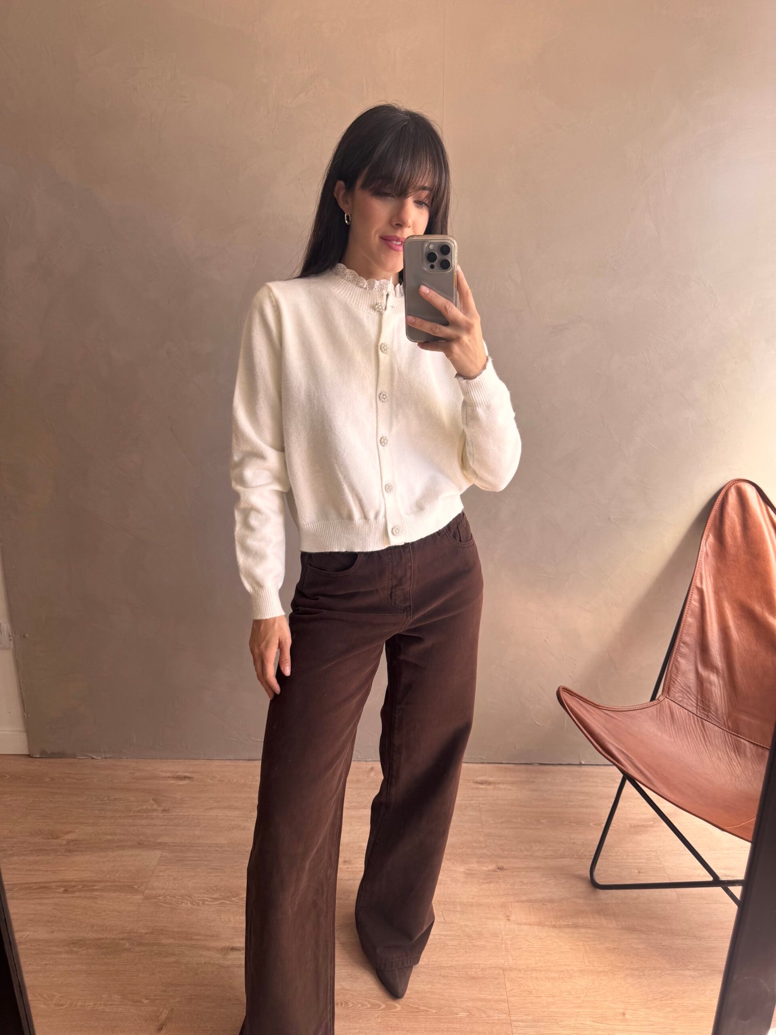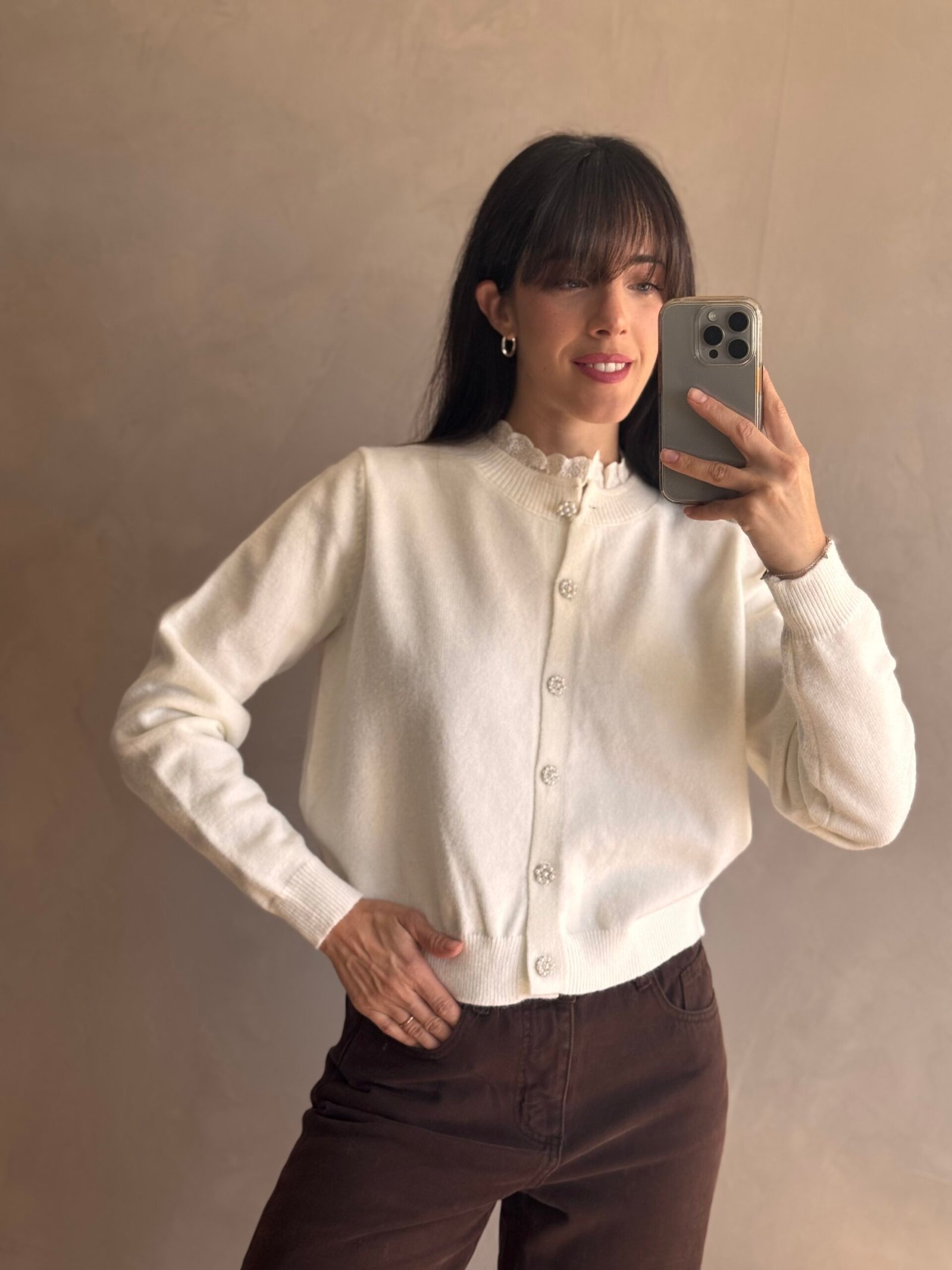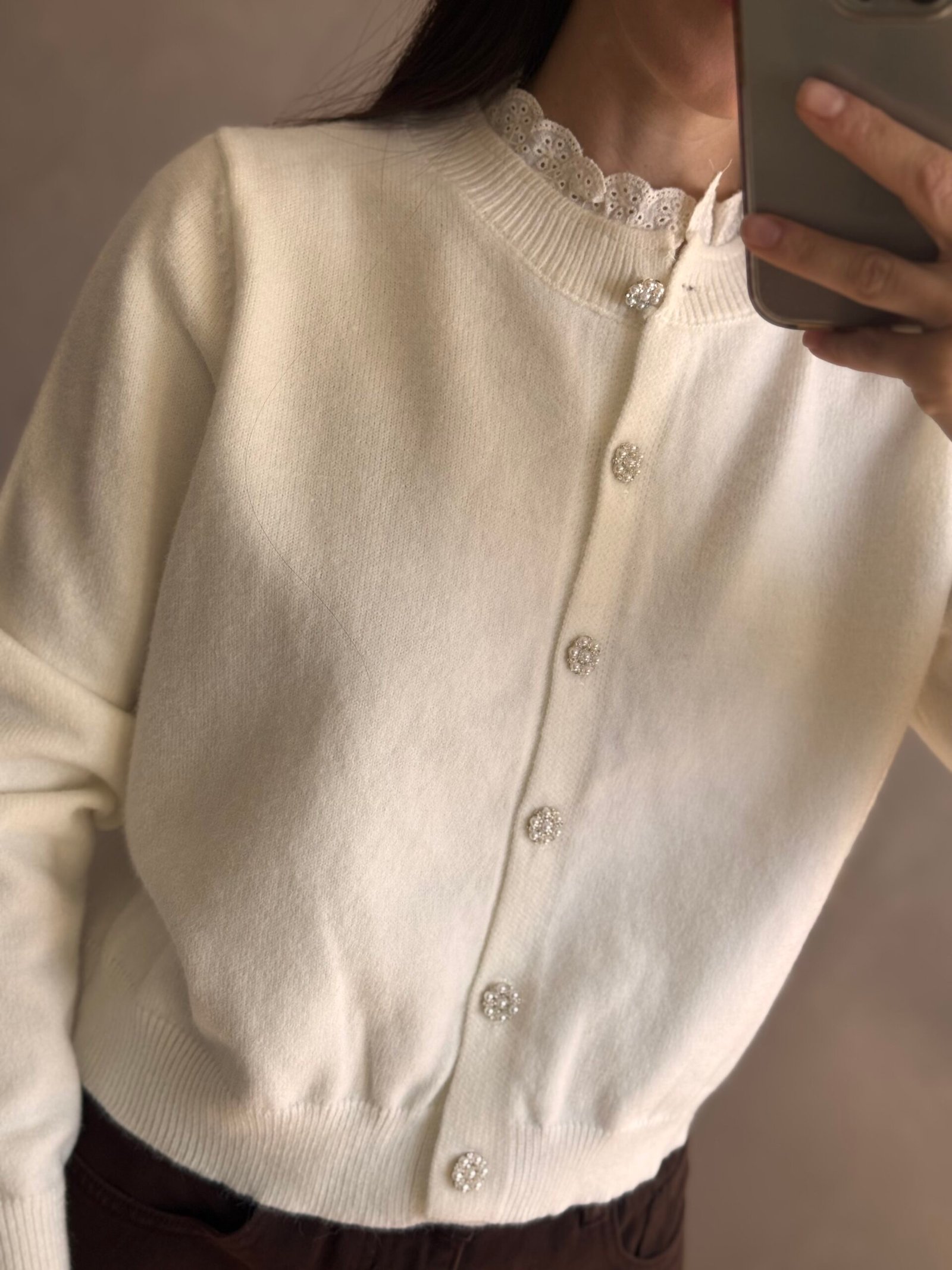 Cardigan de lana con botones de piedras y cuello de brodery