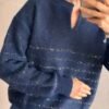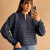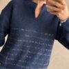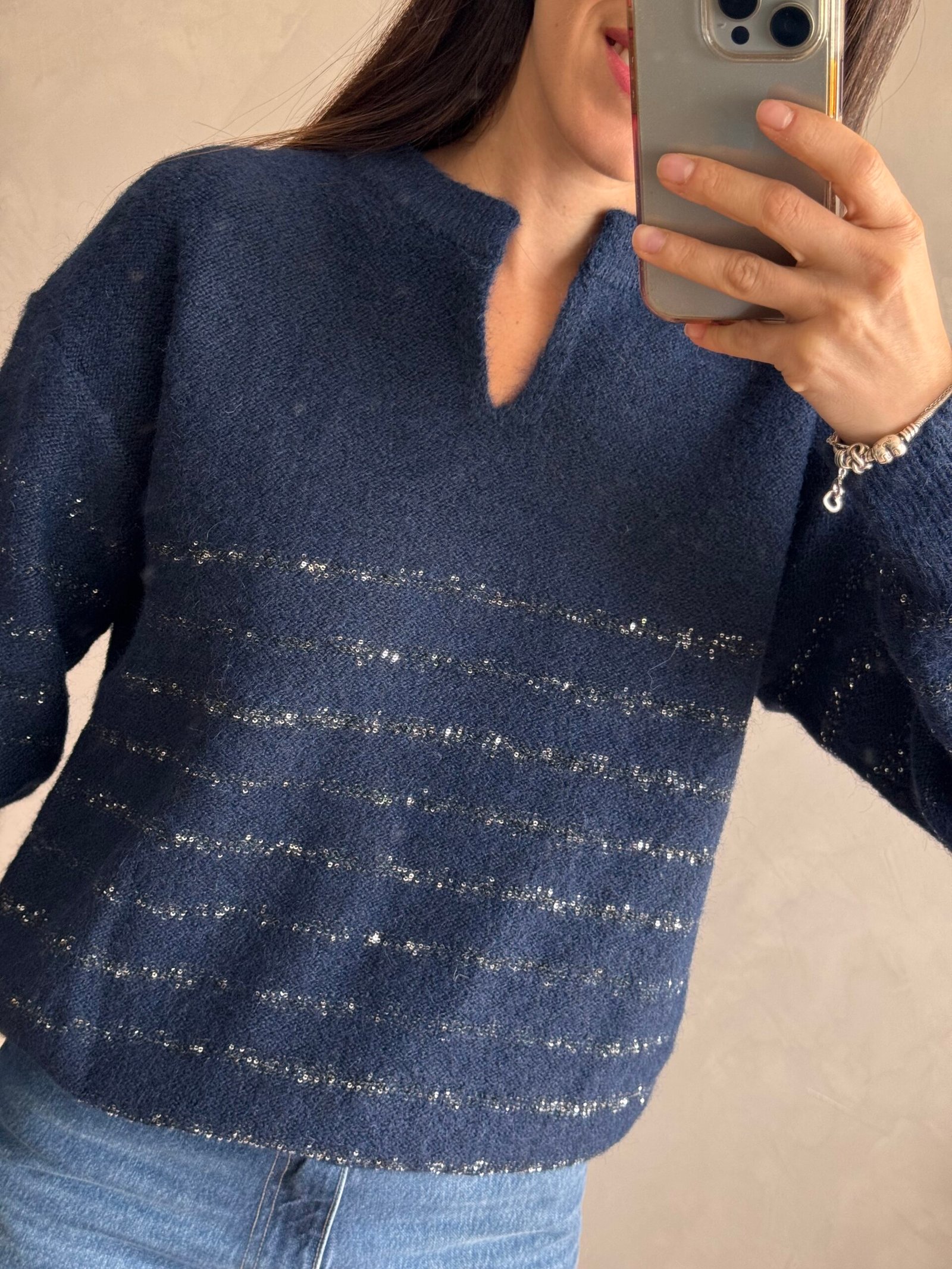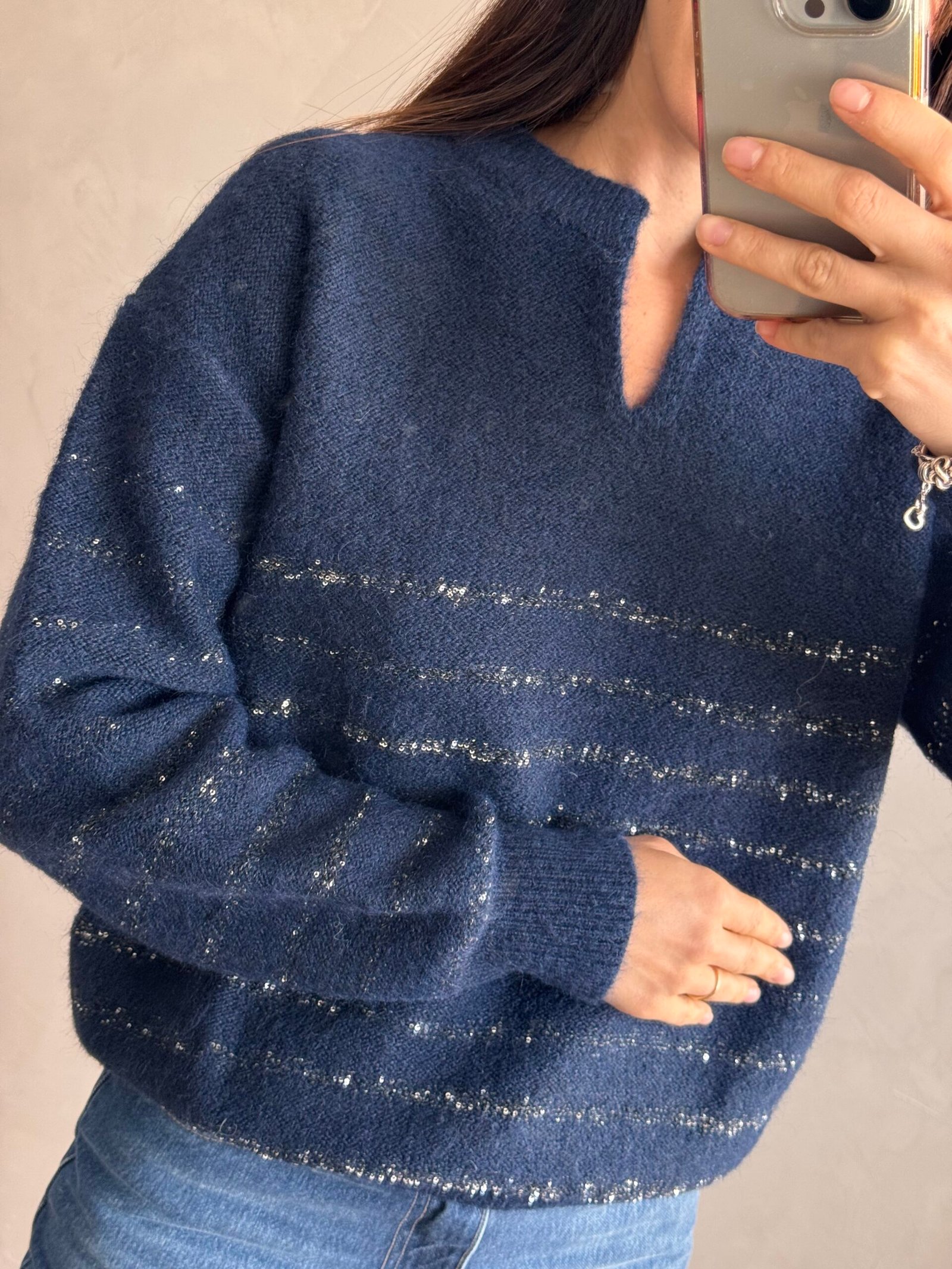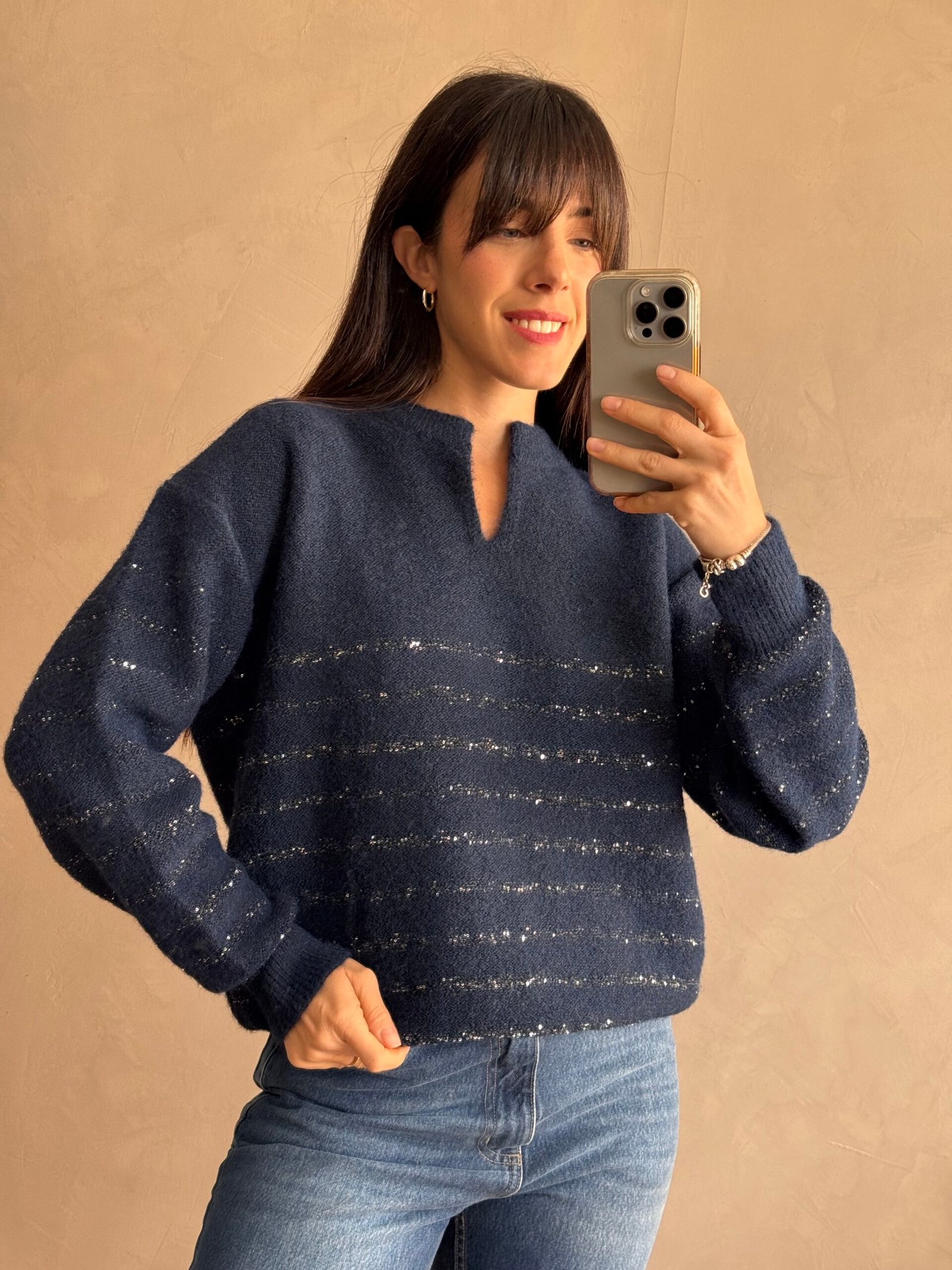 Sweater de lana con cuello redondo, escote en pico y acabados en ribb, con detalles de lentejuelas