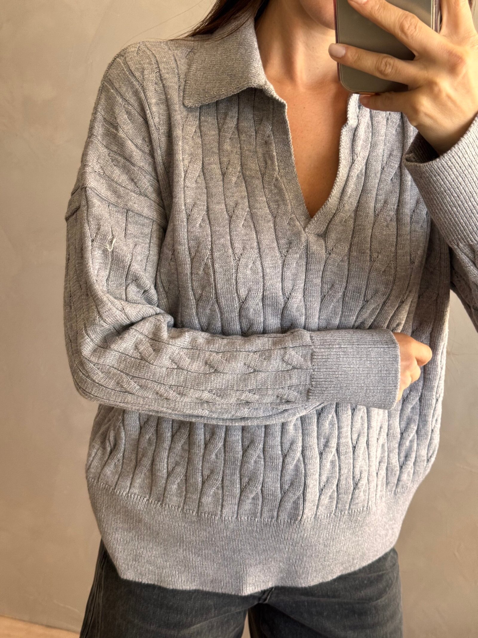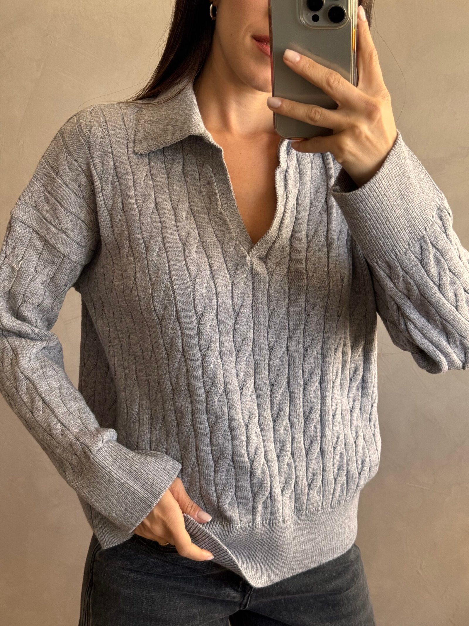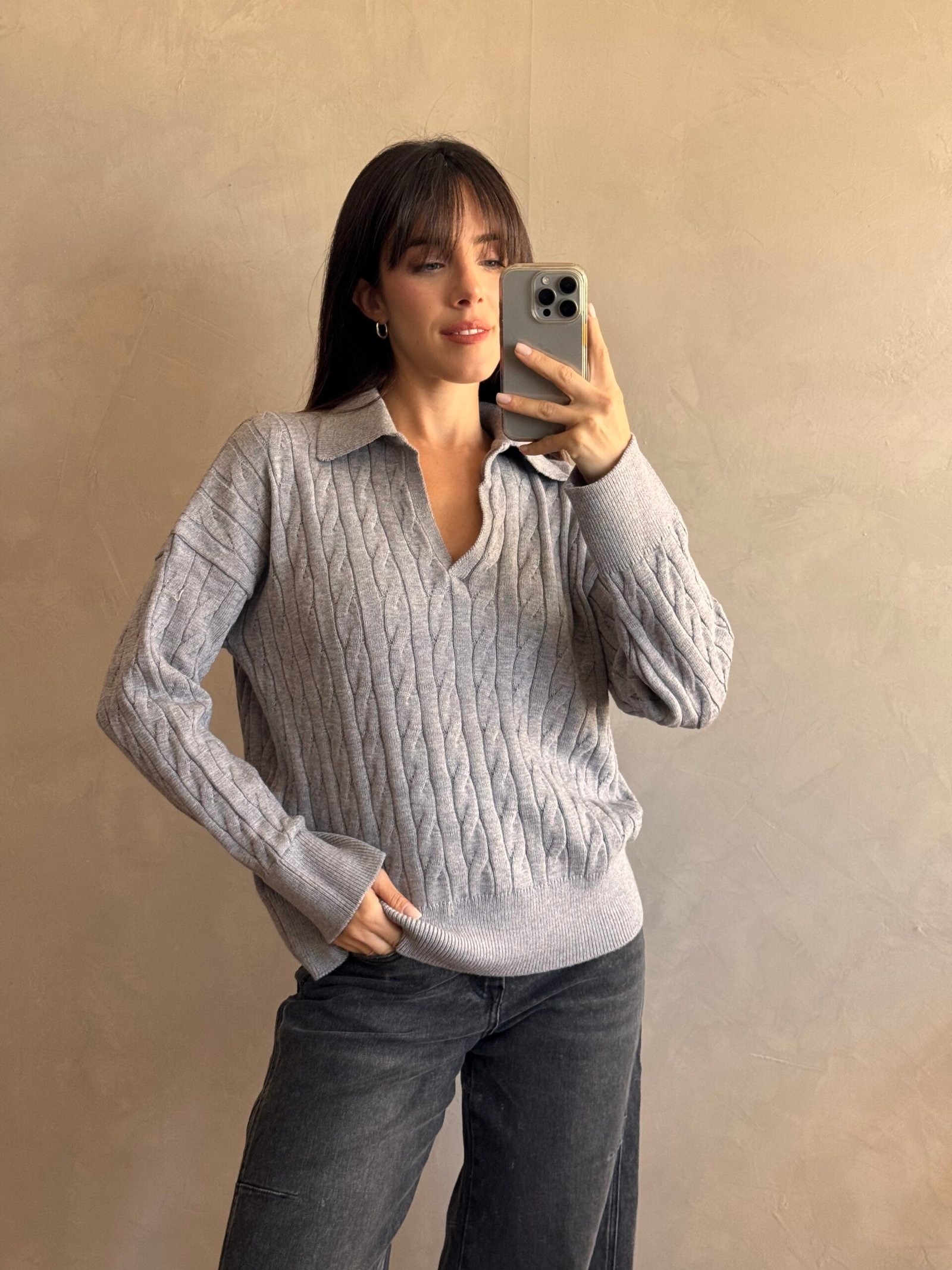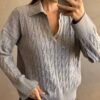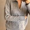 Sweater tejido con fibra en punto trenzado. Posee escote en “v” con cuello tipo polo