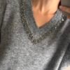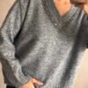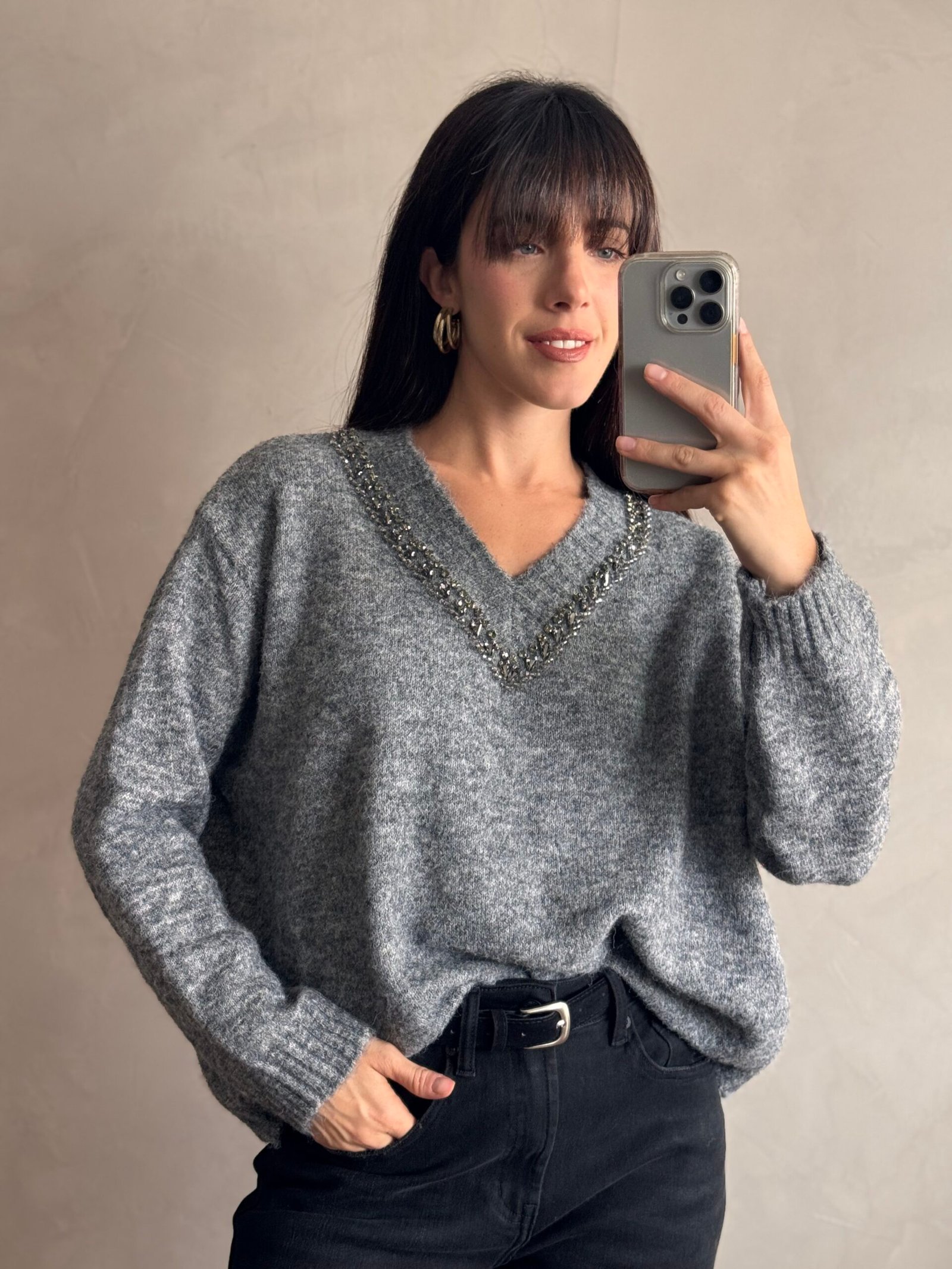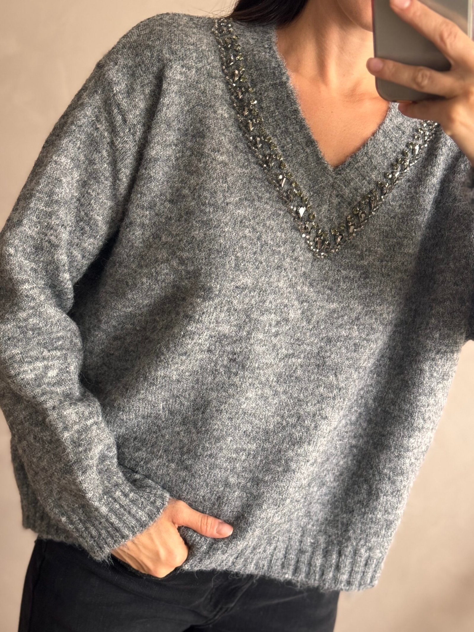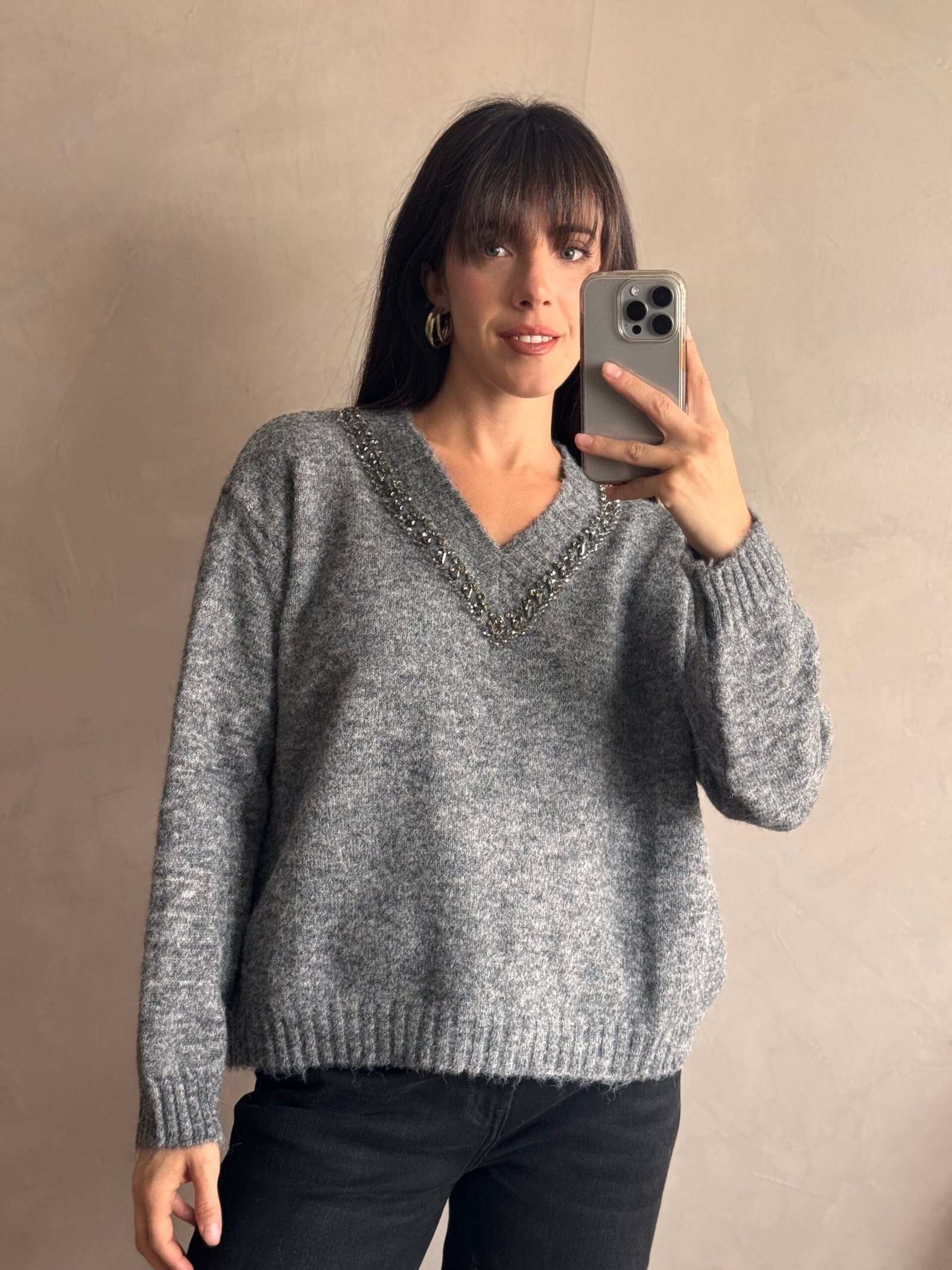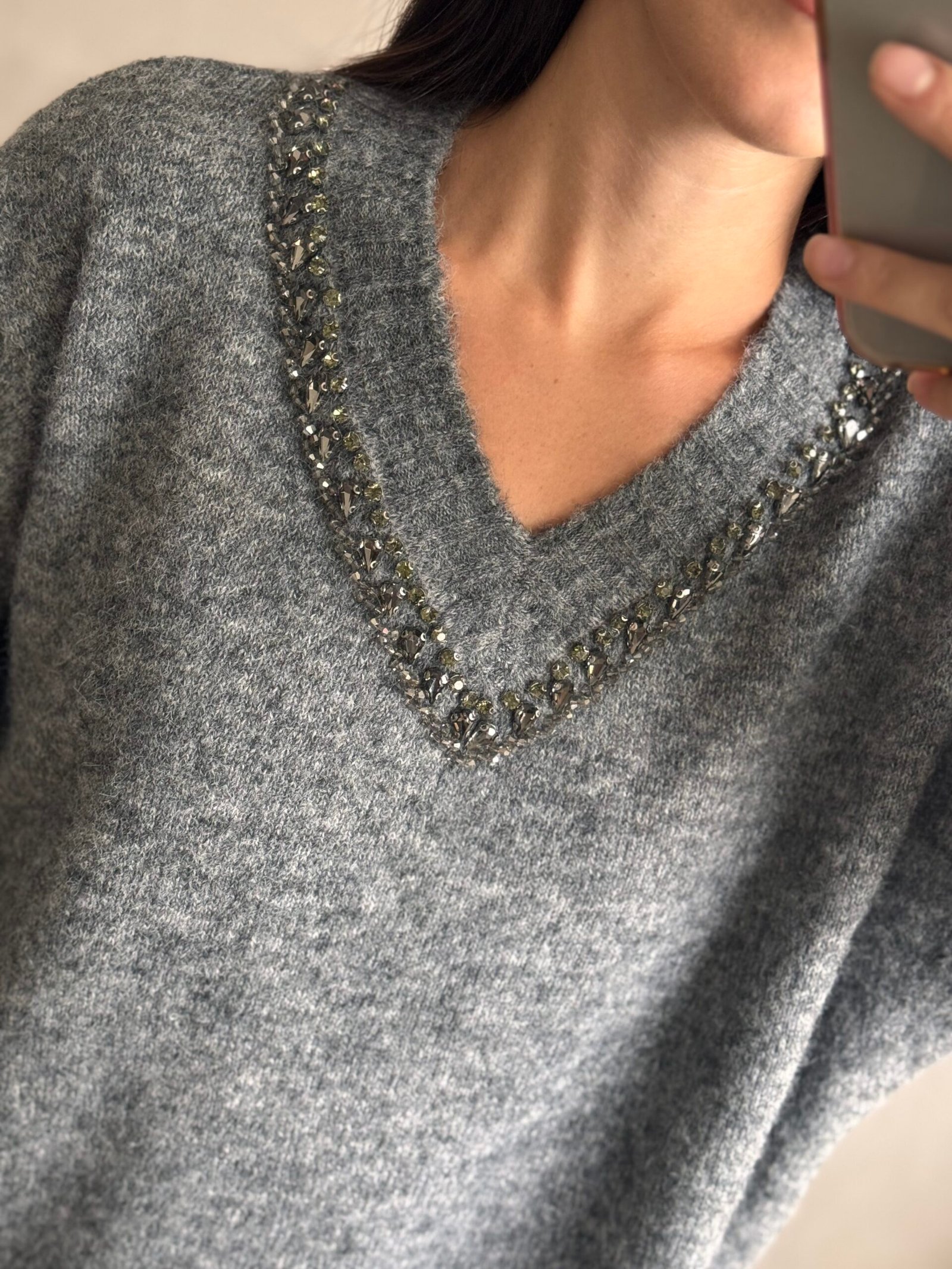 Sweater de lana con bordado de piedras en el escote en V