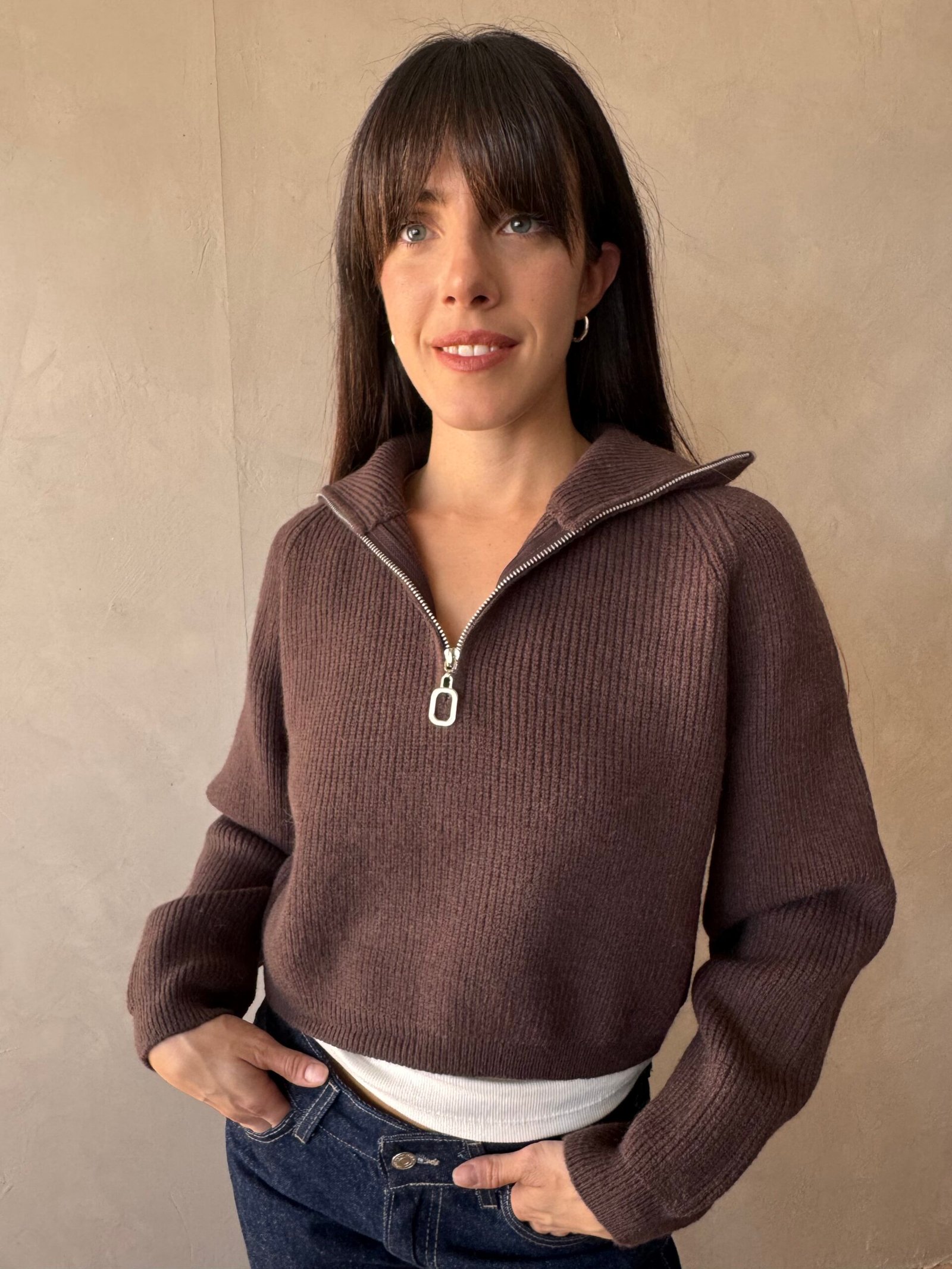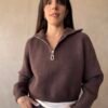 Sweater crop con cierre al escote y cuello alto