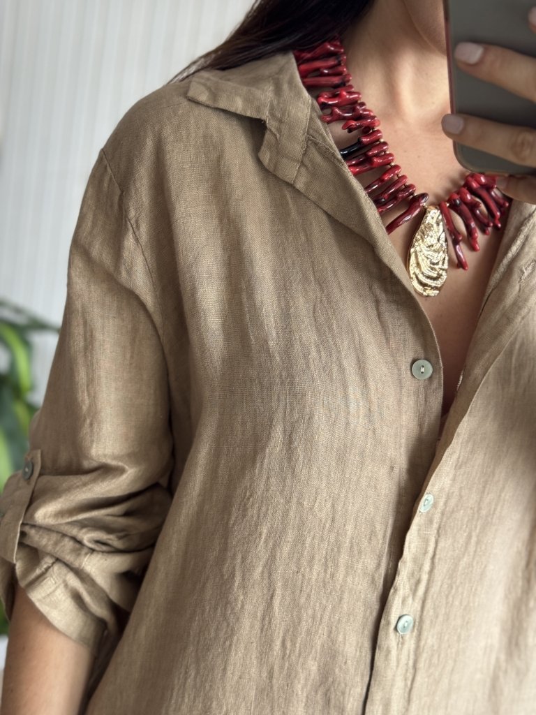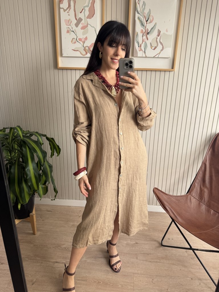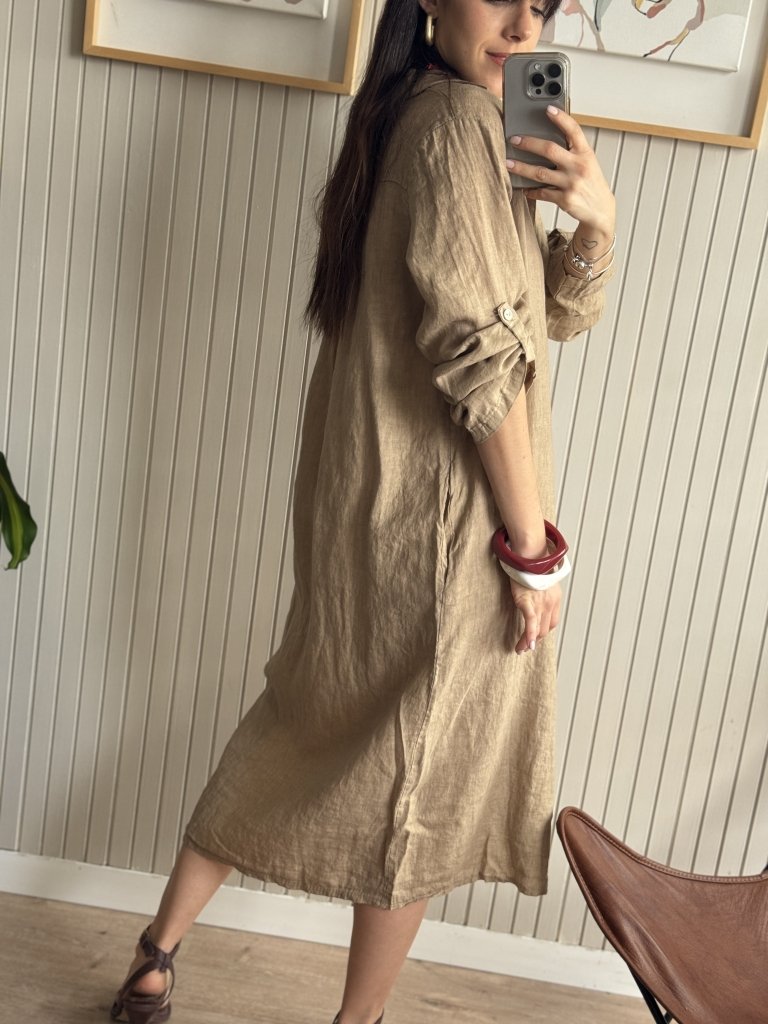 Vestido camisero largo con bolsillos al costado y posibilidad de arremangar las mangas