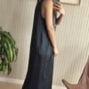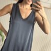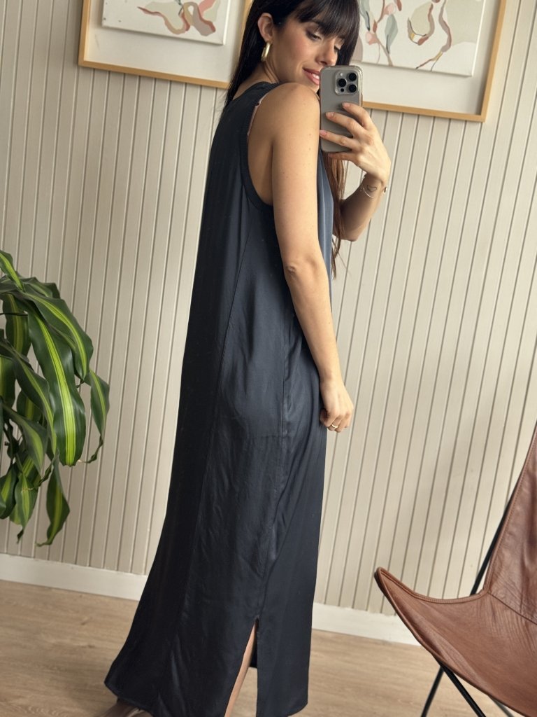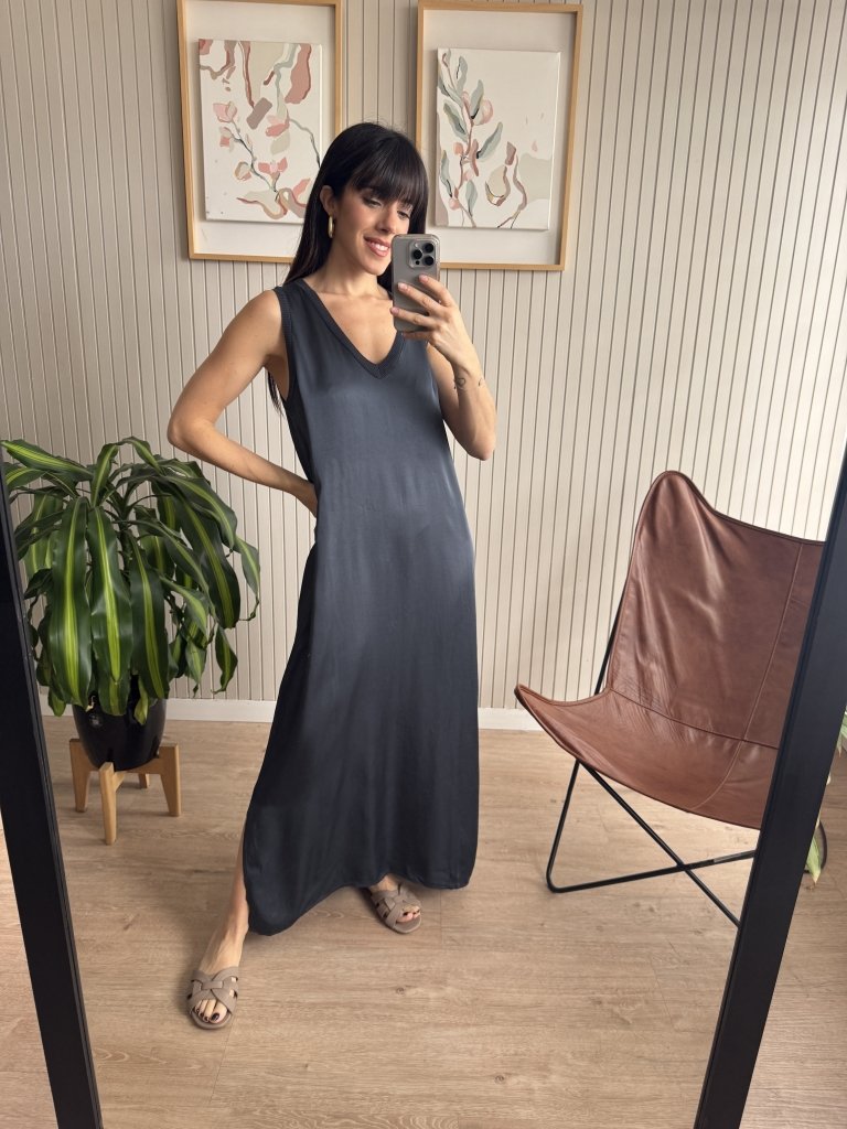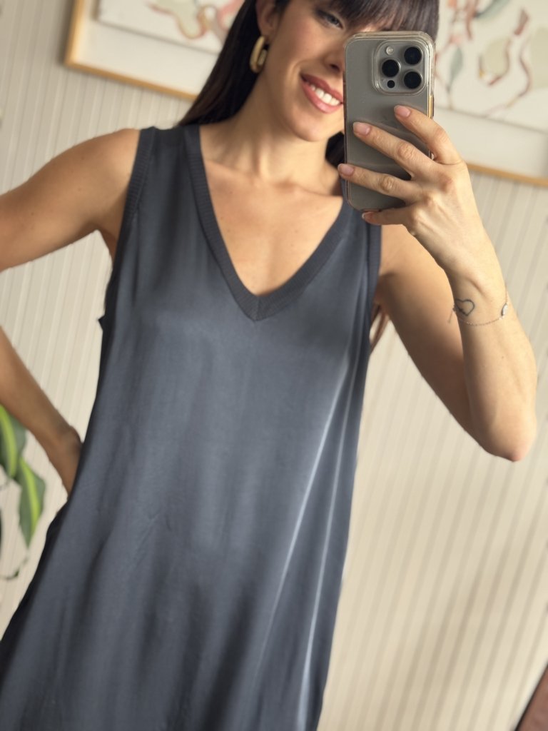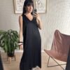 Vestido de seda con escote en V y ribete de morley de algodón al tono.
